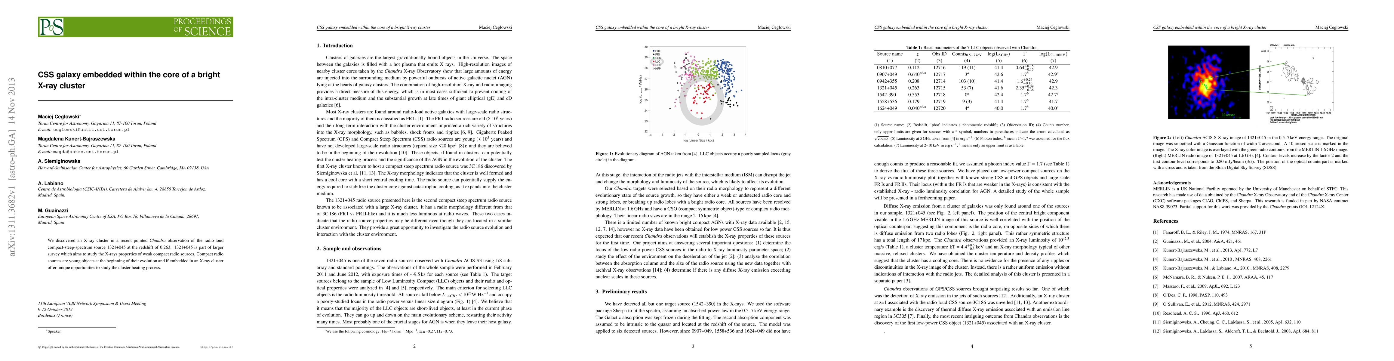 We discovered an X-ray cluster in a recent pointed Chandra observation of the radio-loud compact-steep-spectrum source 1321+045 at the redshift of 0.263. 1321+045 is part of larger survey which aims to study the X-rays properties of weak compact radio sources. Compact radio sources are young objects at the beginning of their evolution and if embedded in an X-ray cluster offer unique opportunities to study the cluster heating process.