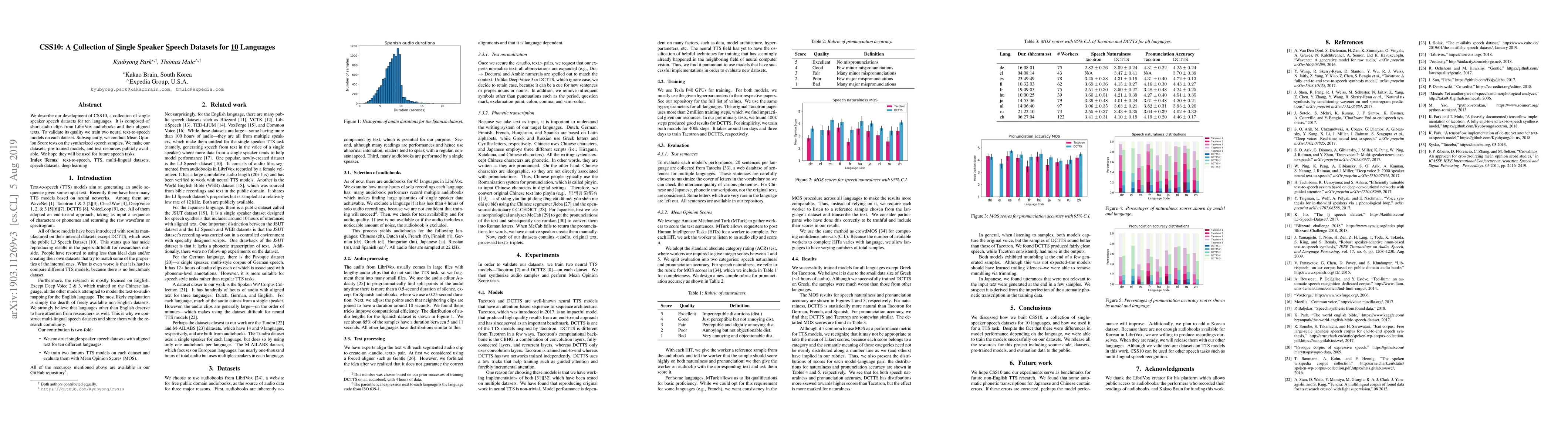 A new dataset called CSS10 has been created with audio clips from 10 languages, allowing researchers to test speech-to-text models in different languages. The datasets and pre-trained models have been made publicly available for use in future speech-related research tasks.