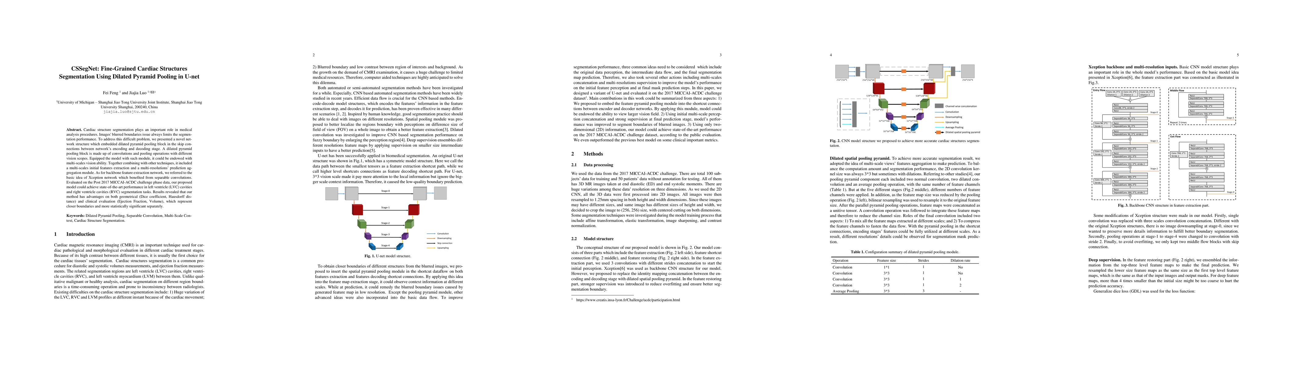 CSSegNet introduces a novel network with dilated pyramid pooling in U-net for enhanced cardiac structure segmentation, achieving state-of-the-art performance in left and right ventricle cavity segmentation through multi-scale vision and separable convolutions. The model demonstrates superior results in both geometrical and clinical evaluations.