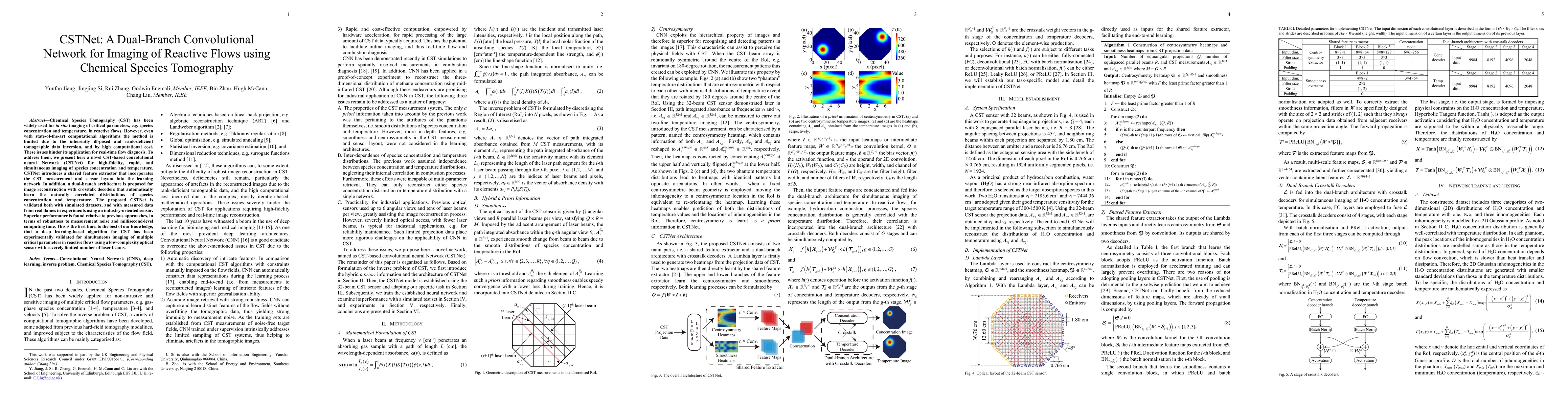 Chemical Species Tomography (CST) has been widely used for in situ imaging of critical parameters, e.g. species concentration and temperature, in reactive flows. However, even with state-of-the-art computational algorithms the method is limited due to the inherently ill-posed and rank-deficient tomographic data inversion, and by high computational cost. These issues hinder its application for real-time flow diagnosis. To address them, we present here a novel CST-based convolutional neural Network (CSTNet) for high-fidelity, rapid, and simultaneous imaging of species concentration and temperature. CSTNet introduces a shared feature extractor that incorporates the CST measurement and sensor layout into the learning network. In addition, a dual-branch architecture is proposed for image reconstruction with crosstalk decoders that automatically learn the naturally correlated distributions of species concentration and temperature. The proposed CSTNet is validated both with simulated datasets, and with measured data from real flames in experiments using an industry-oriented sensor. Superior performance is found relative to previous approaches, in terms of robustness to measurement noise and millisecond-level computing time. This is the first time, to the best of our knowledge, that a deep learning-based algorithm for CST has been experimentally validated for simultaneous imaging of multiple critical parameters in reactive flows using a low-complexity optical sensor with severely limited number of laser beams.