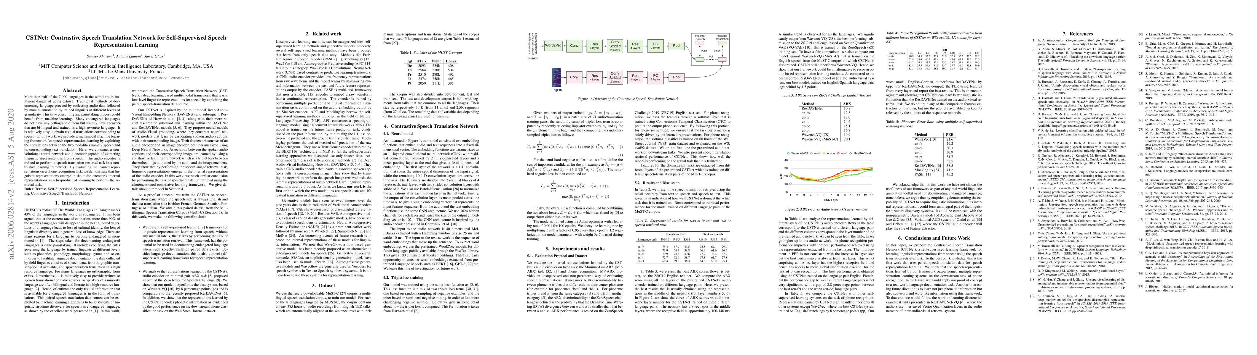 More than half of the 7,000 languages in the world are in imminent danger of going extinct. Traditional methods of documenting language proceed by collecting audio data followed by manual annotation by trained linguists at different levels of granularity. This time consuming and painstaking process could benefit from machine learning. Many endangered languages do not have any orthographic form but usually have speakers that are bi-lingual and trained in a high resource language. It is relatively easy to obtain textual translations corresponding to speech. In this work, we provide a multimodal machine learning framework for speech representation learning by exploiting the correlations between the two modalities namely speech and its corresponding text translation. Here, we construct a convolutional neural network audio encoder capable of extracting linguistic representations from speech. The audio encoder is trained to perform a speech-translation retrieval task in a contrastive learning framework. By evaluating the learned representations on a phone recognition task, we demonstrate that linguistic representations emerge in the audio encoder's internal representations as a by-product of learning to perform the retrieval task.