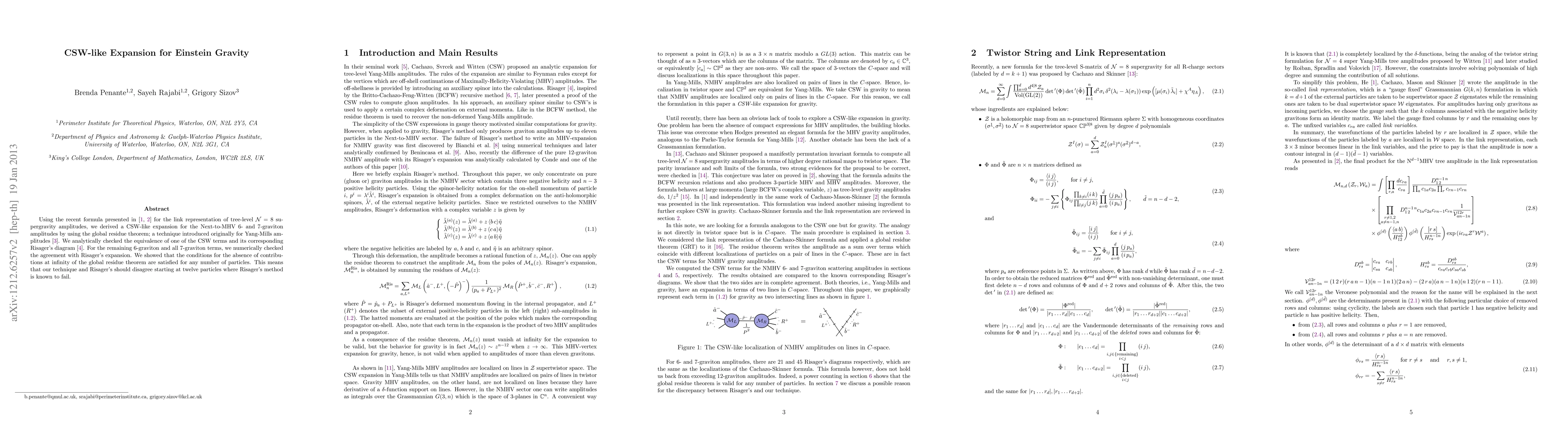 Using the recent formula presented by He and Cachazo-Mason-Skinner for the link representation of tree-level N=8 supergravity amplitudes, we derived a CSW-like expansion for the Next-to-MHV 6- and 7-graviton amplitudes by using the global residue theorem; a technique introduced originally for Yang-Mills amplitudes. We analytically checked the equivalence of one of the CSW terms and its corresponding Risager's diagram. For the remaining 6-graviton and all 7-graviton terms, we numerically checked the agreement with Risager's expansion. We showed that the conditions for the absence of contributions at infinity of the global residue theorem are satisfied for any number of particles. This means that our technique and Risager's should disagree starting at twelve particles where Risager's method is known to fail.