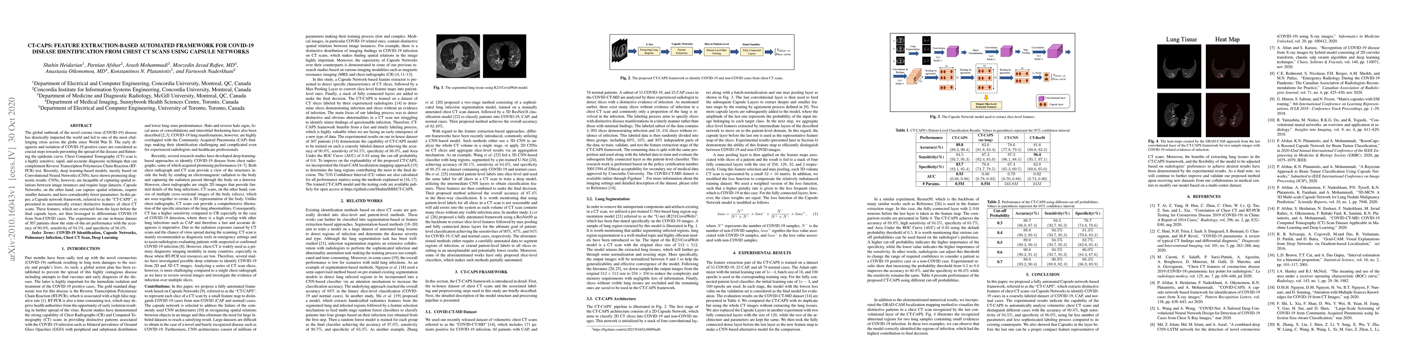 The paper introduces CT-CAPS, a Capsule Network-based framework for automated COVID-19 identification from chest CT scans, demonstrating superior feature extraction and spatial relation capture compared to CNNs. The model achieves 90.8% accuracy, 94.5% sensitivity, and 86.0% specificity on an in-house dataset.