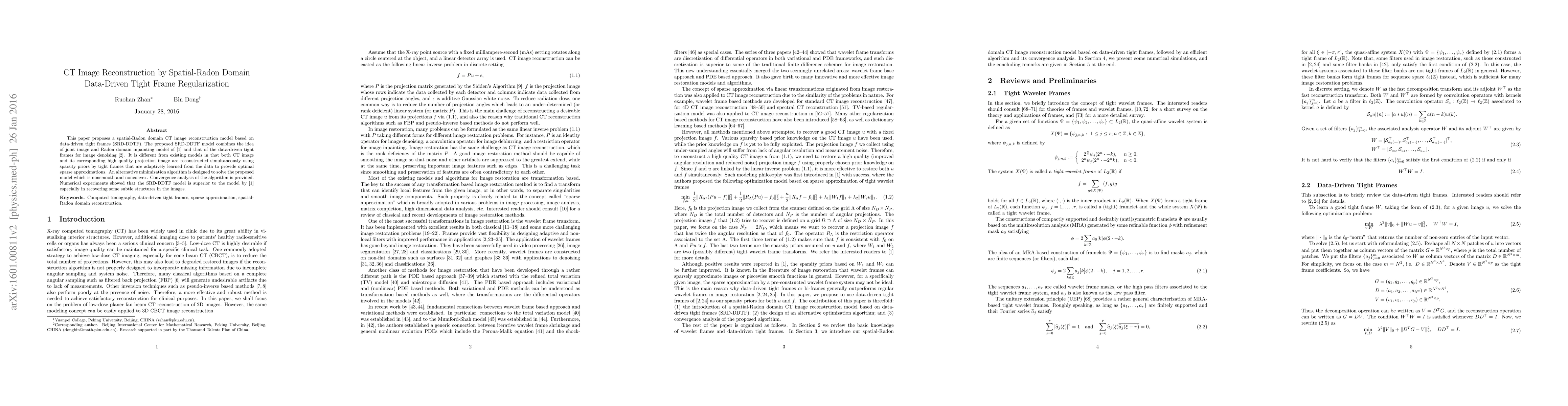 This paper introduces a spatial-Radon domain CT image reconstruction model using data-driven tight frames (SRD-DDTF) that simultaneously reconstructs CT images and their projection data, leveraging adaptively learned sparsity priors. An alternative minimization algorithm is developed to solve the nonsmooth, nonconvex problem, demonstrating superior performance in recovering subtle image structures.
