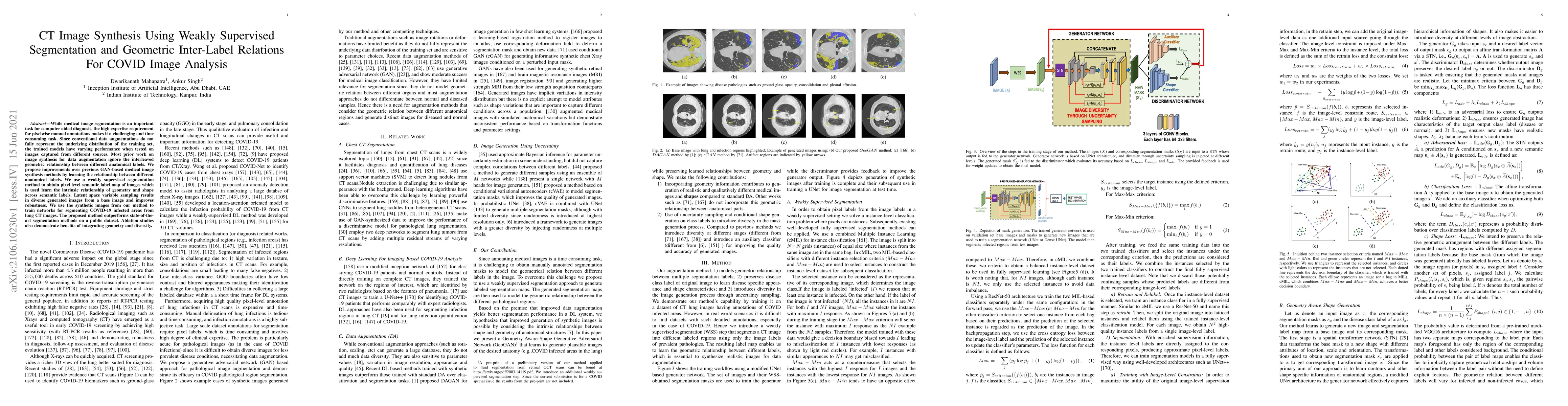 While medical image segmentation is an important task for computer aided diagnosis, the high expertise requirement for pixelwise manual annotations makes it a challenging and time consuming task. Since conventional data augmentations do not fully represent the underlying distribution of the training set, the trained models have varying performance when tested on images captured from different sources. Most prior work on image synthesis for data augmentation ignore the interleaved geometric relationship between different anatomical labels. We propose improvements over previous GAN-based medical image synthesis methods by learning the relationship between different anatomical labels. We use a weakly supervised segmentation method to obtain pixel level semantic label map of images which is used learn the intrinsic relationship of geometry and shape across semantic labels. Latent space variable sampling results in diverse generated images from a base image and improves robustness. We use the synthetic images from our method to train networks for segmenting COVID-19 infected areas from lung CT images. The proposed method outperforms state-of-the-art segmentation methods on a public dataset. Ablation studies also demonstrate benefits of integrating geometry and diversity.