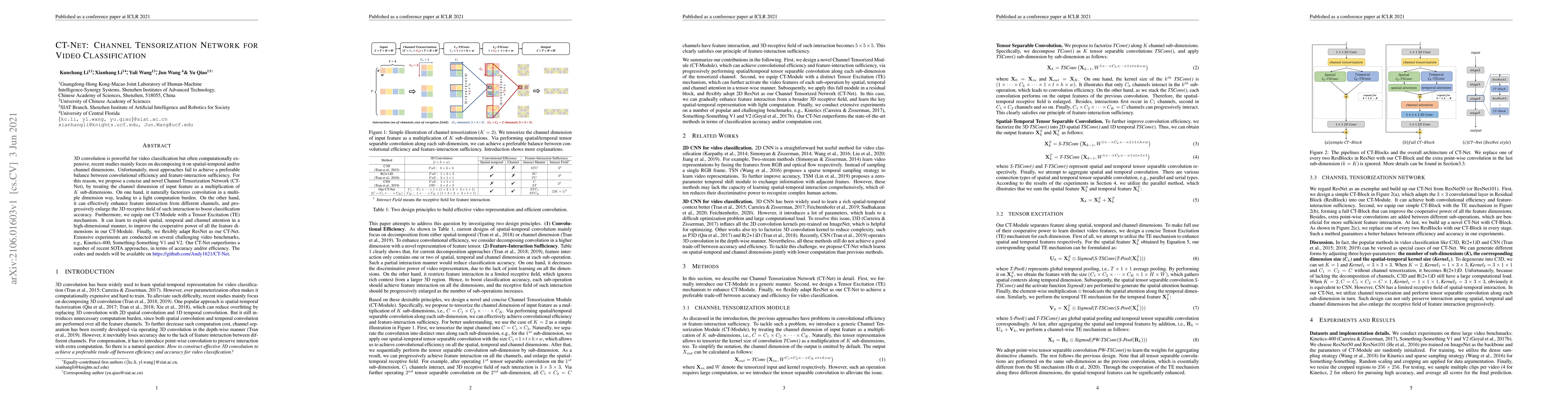 The CT-Net proposes a novel Channel Tensorization Network for efficient video classification by decomposing convolutions across multiple dimensions, enhancing feature interaction, and employing a Tensor Excitation mechanism for high-dimensional attention, achieving superior accuracy and efficiency over recent state-of-the-art methods.