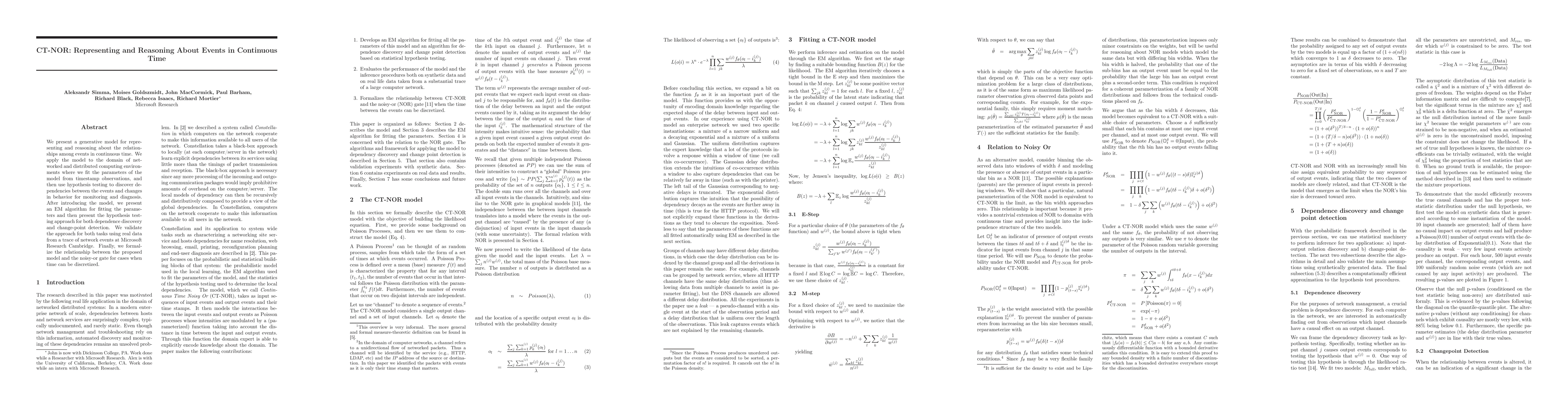 This paper introduces CT-NOR, a generative model for representing and reasoning about event relationships in continuous time, applied to networked computing environments. It employs an EM algorithm for parameter fitting and hypothesis testing for dependency discovery and change-point detection, validated with real network event data.