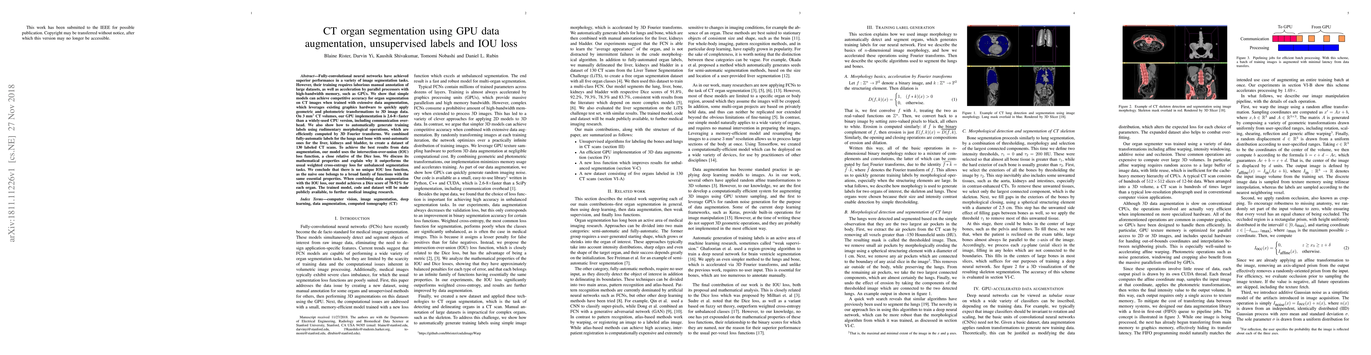 This paper presents a method for CT organ segmentation using GPU-based data augmentation and unsupervised label generation, achieving competitive accuracy with a fully-convolutional neural network. The use of the intersection-over-union (IOU) loss function, combined with data augmentation, improves performance over traditional methods, resulting in Dice scores of 78-92% for various organs.
