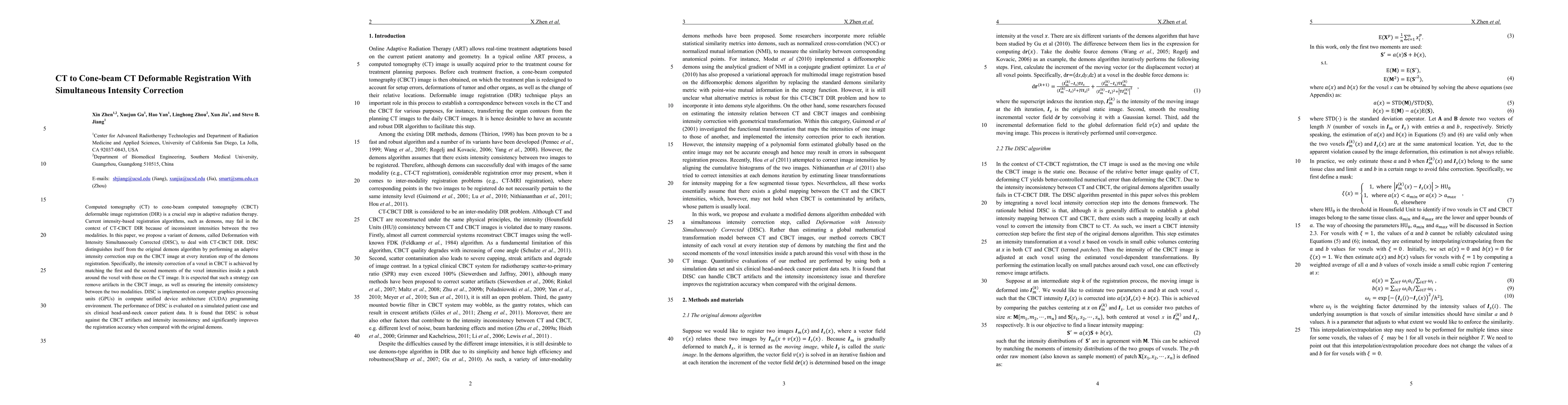 This paper proposes a new deformable registration algorithm called DISC for aligning CT to CBCT images, addressing intensity inconsistencies between the two modalities. DISC incorporates an adaptive intensity correction step during registration, improving registration accuracy and robustness against CBCT artifacts.