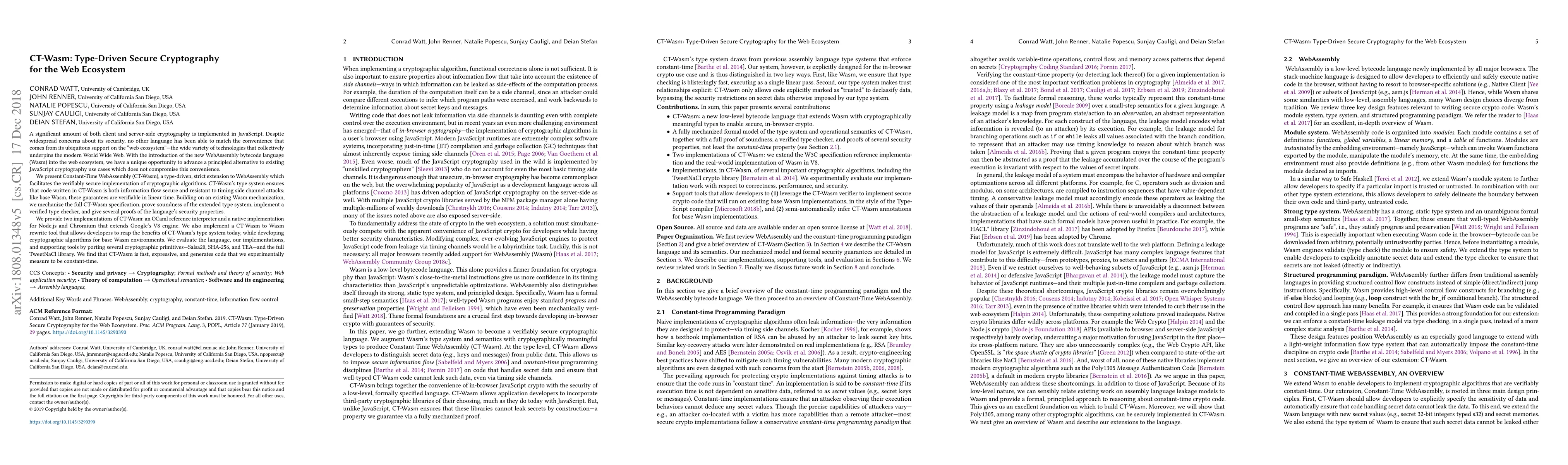 CT-Wasm is a type-driven extension to WebAssembly designed for secure cryptography, ensuring constant-time execution and resistance to side-channel attacks. It provides a verified, convenient alternative to JavaScript's insecure cryptographic implementations, with implementations and tools supporting its use in Node.js and Chromium environments.