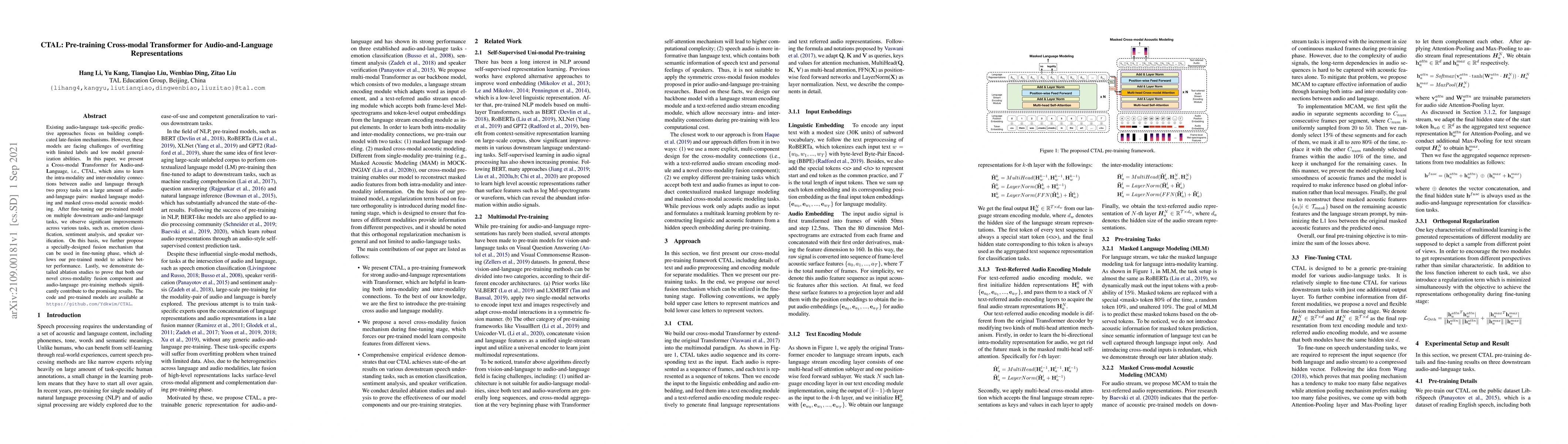 This paper introduces CTAL, a Cross-modal Transformer for Audio-and-Language pre-training, which learns connections between audio and language through masked modeling tasks. The pre-trained model shows improved performance across various tasks and benefits from a specially-designed fusion mechanism during fine-tuning.