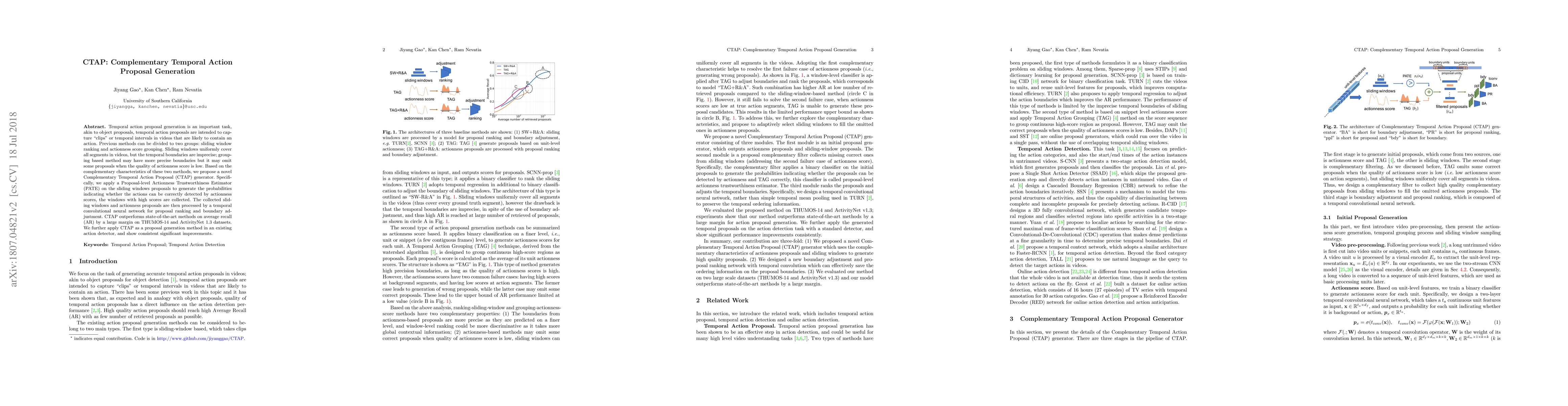 The paper introduces a novel Complementary Temporal Action Proposal (CTAP) generator that combines the strengths of sliding window ranking and actionness score grouping to generate precise temporal action proposals in videos. CTAP outperforms existing methods on average recall on THUMOS-14 and ActivityNet 1.3 datasets and enhances action detection performance when integrated into an existing action detector.
