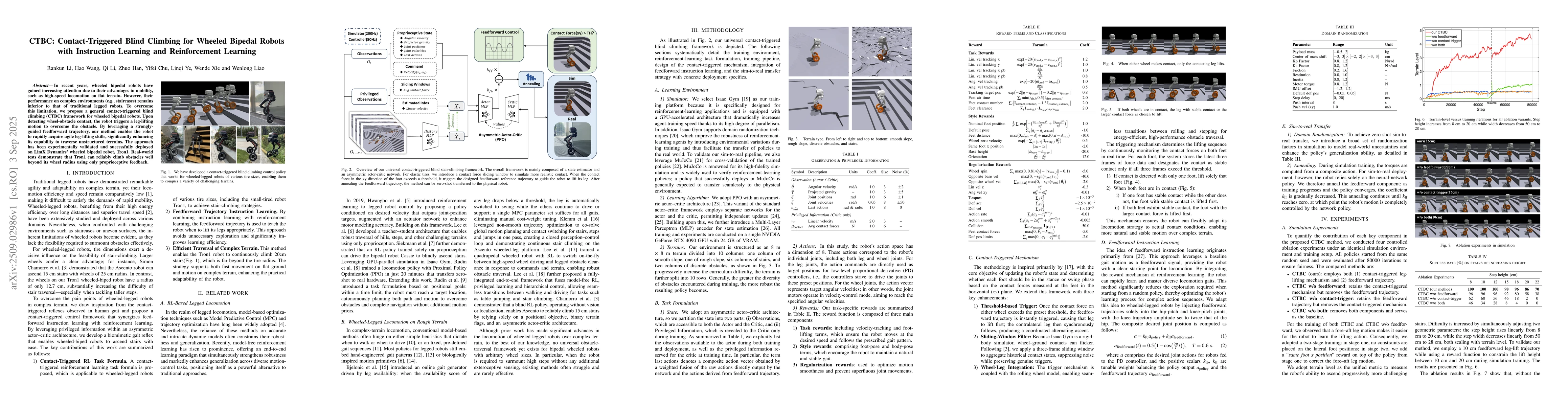 In recent years, wheeled bipedal robots have gained increasing attention due to their advantages in mobility, such as high-speed locomotion on flat terrain. However, their performance on complex environments (e.g., staircases) remains inferior to that of traditional legged robots. To overcome this limitation, we propose a general contact-triggered blind climbing (CTBC) framework for wheeled bipedal robots. Upon detecting wheel-obstacle contact, the robot triggers a leg-lifting motion to overcome the obstacle. By leveraging a strongly-guided feedforward trajectory, our method enables the robot to rapidly acquire agile leg-lifting skills, significantly enhancing its capability to traverse unstructured terrains. The approach has been experimentally validated and successfully deployed on LimX Dynamics' wheeled bipedal robot, Tron1. Real-world tests demonstrate that Tron1 can reliably climb obstacles well beyond its wheel radius using only proprioceptive feedback.