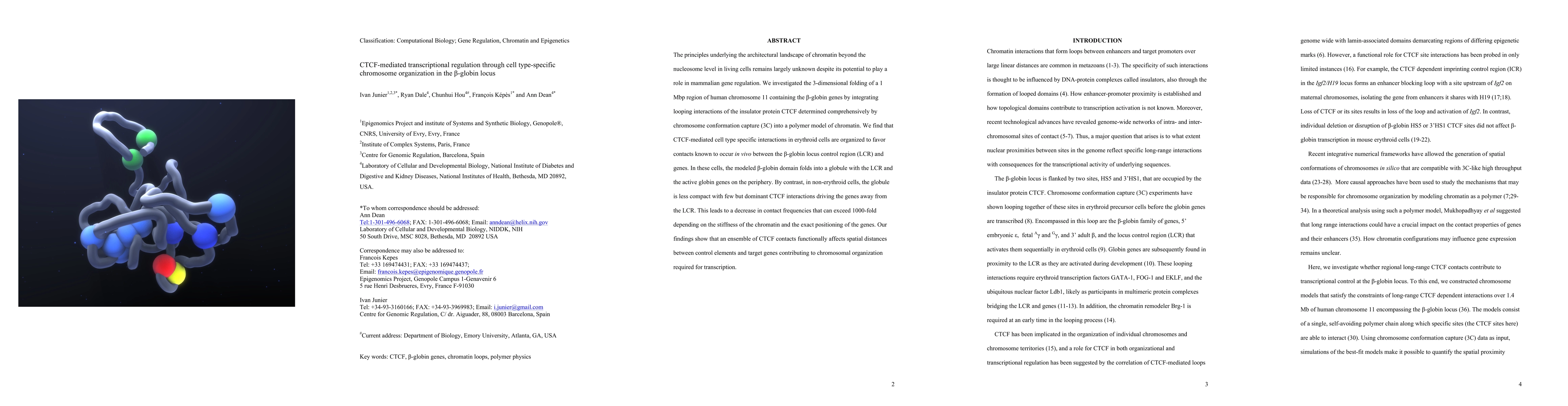 The principles underlying the architectural landscape of chromatin beyond the nucleosome level in living cells remains largely unknown despite its potential to play a role in mammalian gene regulation. We investigated the 3-dimensional folding of a 1 Mbp region of human chromosome 11 containing the {\beta}-globin genes by integrating looping interactions of the insulator protein CTCF determined comprehensively by chromosome conformation capture (3C) into a polymer model of chromatin. We find that CTCF-mediated cell type specific interactions in erythroid cells are organized to favor contacts known to occur in vivo between the {\beta}-globin locus control region (LCR) and genes. In these cells, the modeled {\beta}-globin domain folds into a globule with the LCR and the active globin genes on the periphery. By contrast, in non-erythroid cells, the globule is less compact with few but dominant CTCF interactions driving the genes away from the LCR. This leads to a decrease in contact frequencies that can exceed 1000-fold depending on the stiffness of the chromatin and the exact positioning of the genes. Our findings show that an ensemble of CTCF contacts functionally affects spatial distances between control elements and target genes contributing to chromosomal organization required for transcription.