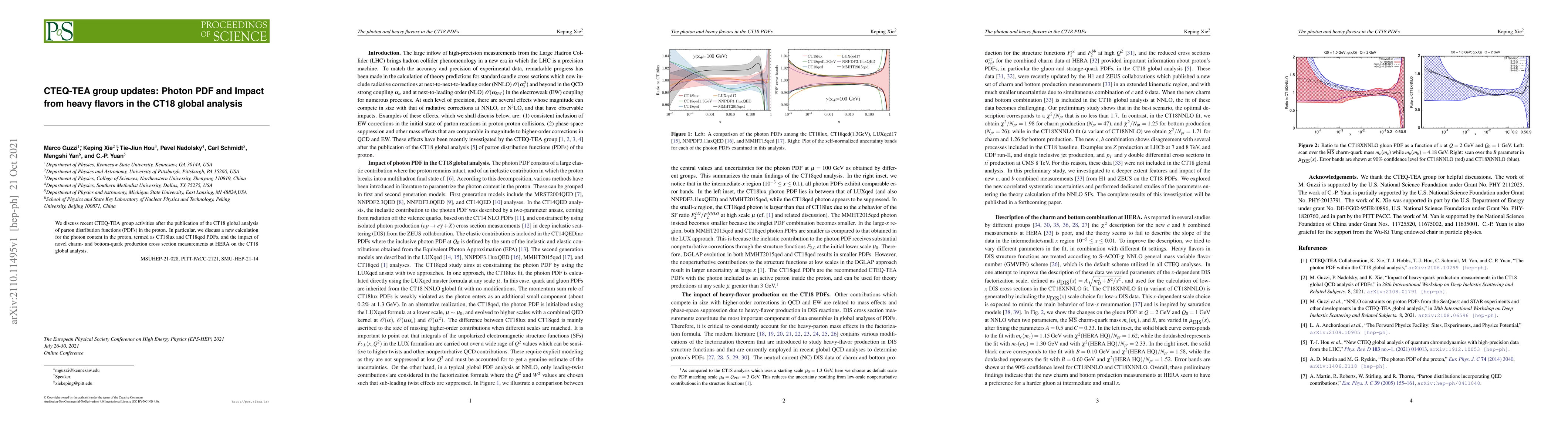 We discuss recent CTEQ-TEA group activities after the publication of the CT18 global analysis of parton distribution functions (PDFs) in the proton. In particular, we discuss a new calculation for the photon content in the proton, termed as CT18lux and CT18qed PDFs, and the impact of novel charm- and bottom-quark production cross section measurements at HERA on the CT18 global analysis.