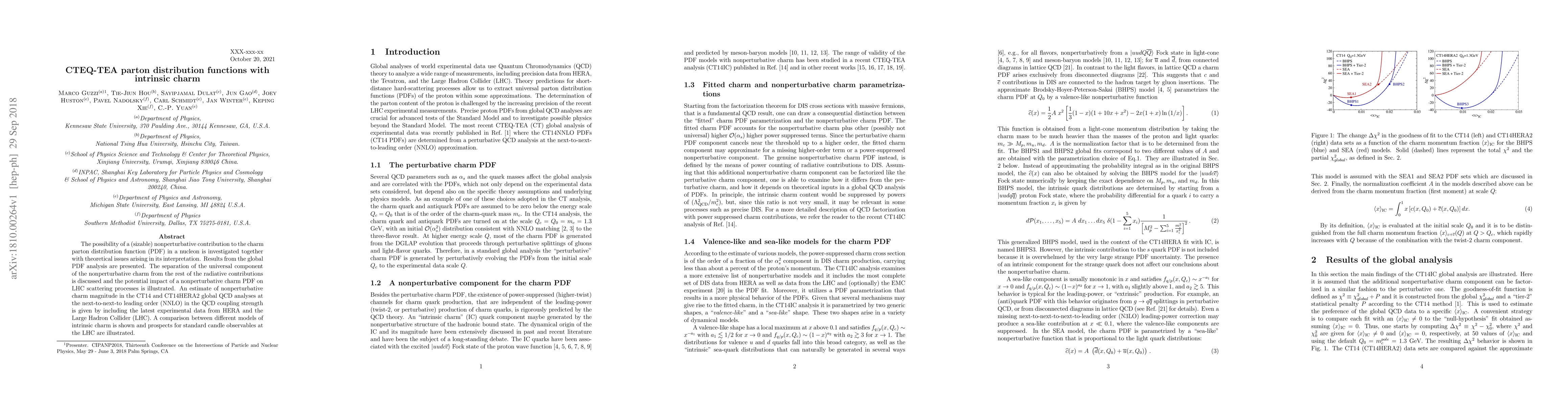 The possibility of a (sizable) nonperturbative contribution to the charm parton distribution function (PDF) in a nucleon is investigated together with theoretical issues arising in its interpretation. Results from the global PDF analysis are presented. The separation of the universal component of the nonperturbative charm from the rest of the radiative contributions is discussed and the potential impact of a nonperturbative charm PDF on LHC scattering processes is illustrated. An estimate of nonperturbative charm magnitude in the CT14 and CT14HERA2 global QCD analyses at the next-to-next-to leading order (NNLO) in the QCD coupling strength is given by including the latest experimental data from HERA and the Large Hadron Collider (LHC). A comparison between different models of intrinsic charm is shown and prospects for standard candle observables at the LHC are illustrated.