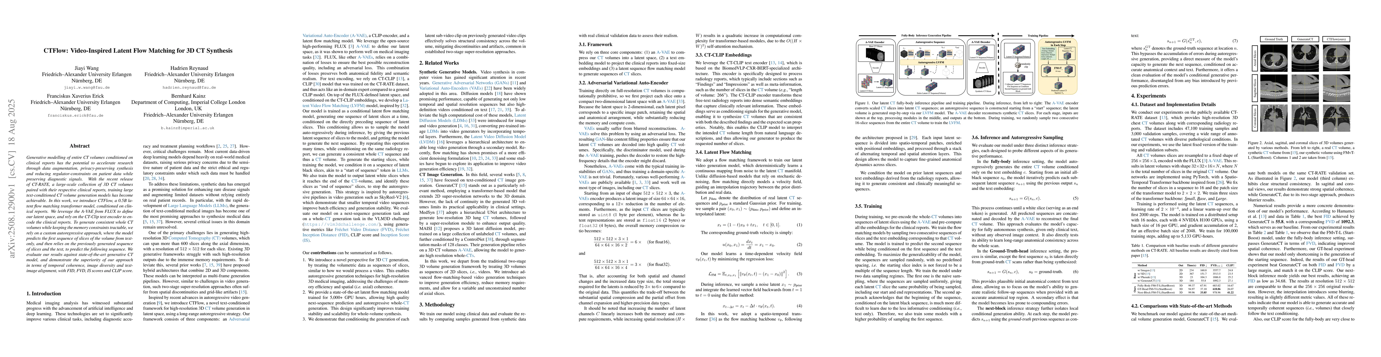 Generative modelling of entire CT volumes conditioned on clinical reports has the potential to accelerate research through data augmentation, privacy-preserving synthesis and reducing regulator-constraints on patient data while preserving diagnostic signals. With the recent release of CT-RATE, a large-scale collection of 3D CT volumes paired with their respective clinical reports, training large text-conditioned CT volume generation models has become achievable. In this work, we introduce CTFlow, a 0.5B latent flow matching transformer model, conditioned on clinical reports. We leverage the A-VAE from FLUX to define our latent space, and rely on the CT-Clip text encoder to encode the clinical reports. To generate consistent whole CT volumes while keeping the memory constraints tractable, we rely on a custom autoregressive approach, where the model predicts the first sequence of slices of the volume from text-only, and then relies on the previously generated sequence of slices and the text, to predict the following sequence. We evaluate our results against state-of-the-art generative CT model, and demonstrate the superiority of our approach in terms of temporal coherence, image diversity and text-image alignment, with FID, FVD, IS scores and CLIP score.