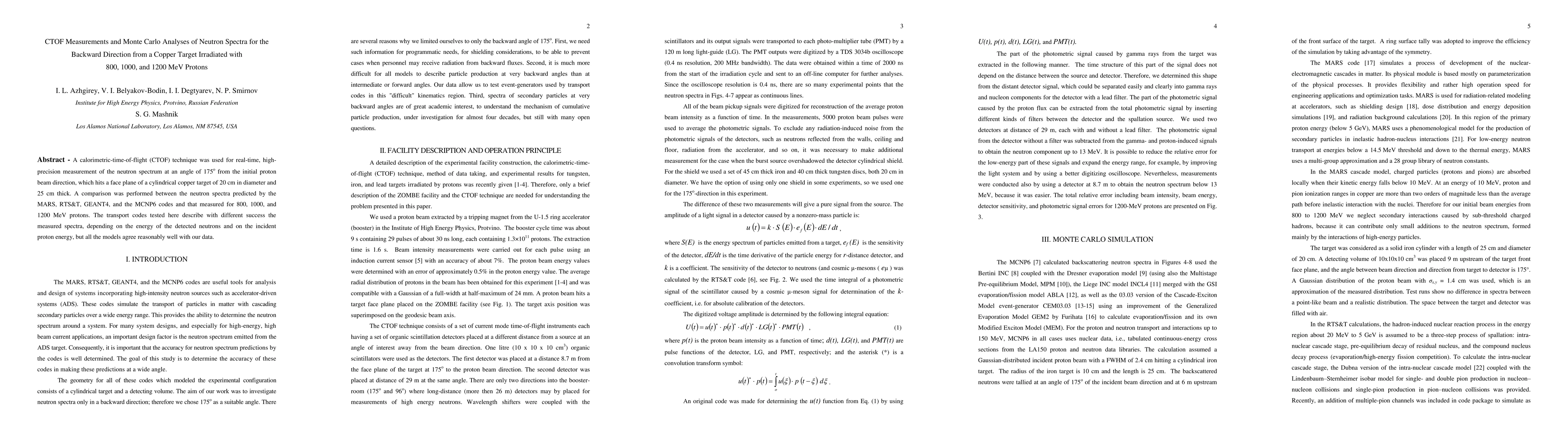 This study uses a CTOF technique to precisely measure neutron spectra at a 175-degree angle from proton-struck copper targets at 800, 1000, and 1200 MeV. It compares these results with predictions from MARS, RTS&T, GEANT4, and MCNP6 codes, finding varying degrees of agreement depending on energy, but overall reasonable correspondence.