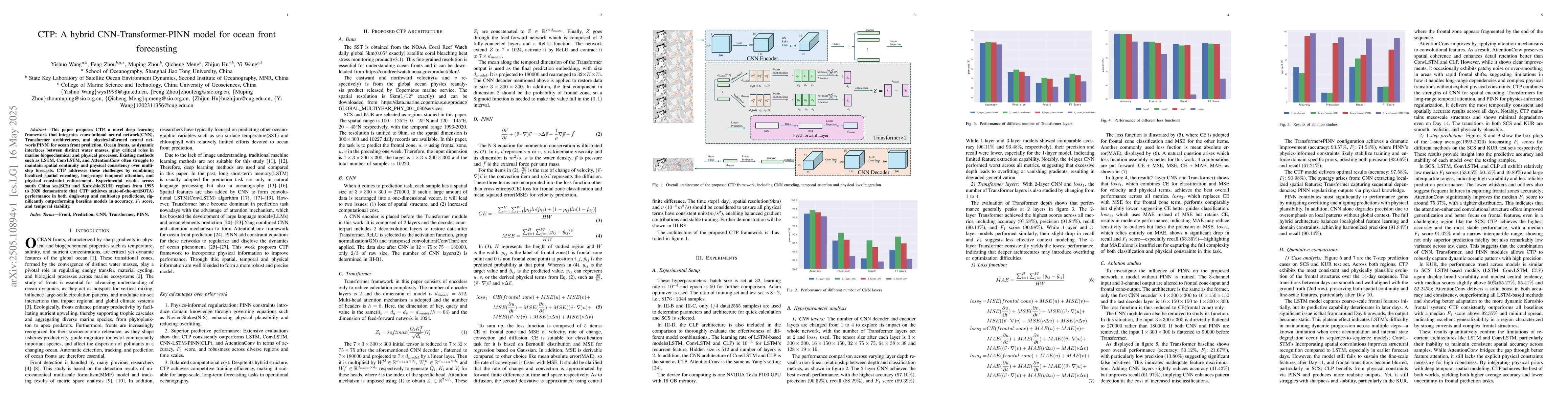 A new model called CTP improves ocean front forecasting by combining CNN, Transformer, and PINN architectures to achieve state-of-the-art performance in accuracy and temporal stability.