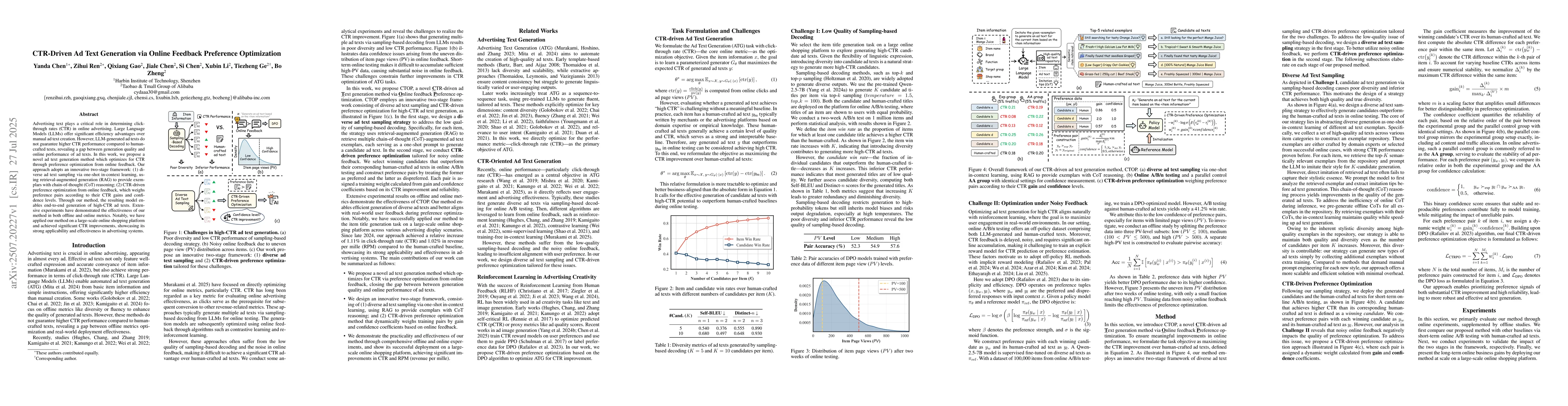 Advertising text plays a critical role in determining click-through rates (CTR) in online advertising. Large Language Models (LLMs) offer significant efficiency advantages over manual ad text creation. However, LLM-generated ad texts do not guarantee higher CTR performance compared to human-crafted texts, revealing a gap between generation quality and online performance of ad texts. In this work, we propose a novel ad text generation method which optimizes for CTR through preference optimization from online feedback. Our approach adopts an innovative two-stage framework: (1) diverse ad text sampling via one-shot in-context learning, using retrieval-augmented generation (RAG) to provide exemplars with chain-of-thought (CoT) reasoning; (2) CTR-driven preference optimization from online feedback, which weighs preference pairs according to their CTR gains and confidence levels. Through our method, the resulting model enables end-to-end generation of high-CTR ad texts. Extensive experiments have demonstrated the effectiveness of our method in both offline and online metrics. Notably, we have applied our method on a large-scale online shopping platform and achieved significant CTR improvements, showcasing its strong applicability and effectiveness in advertising systems.