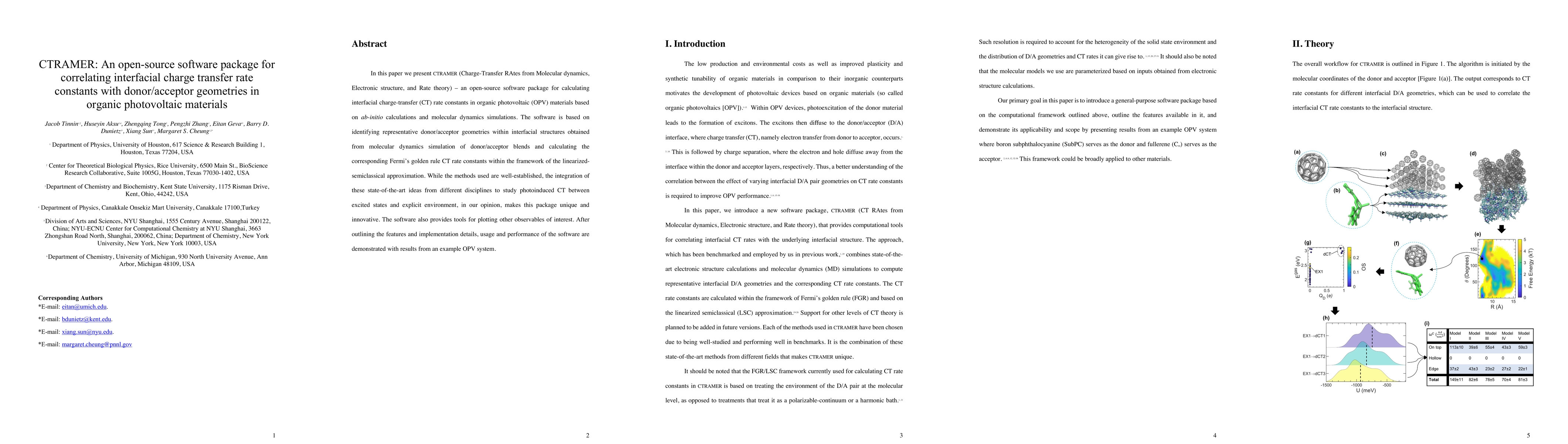 CTRAMER is an open-source software package for calculating interfacial charge transfer rate constants in organic photovoltaic materials using ab initio calculations and molecular dynamics simulations. It uniquely integrates advanced methods from different disciplines to study photoinduced charge transfer.