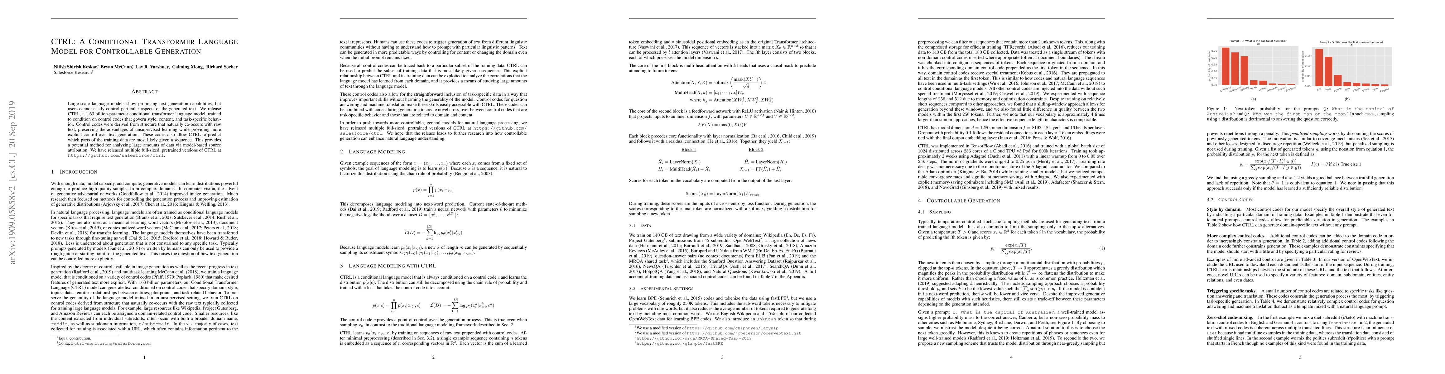 CTRL is a 1.63 billion-parameter conditional transformer model designed to generate text that is controllable via style, content, and task-specific codes. These codes are derived from naturally occurring structures in the training data, enabling explicit control over text generation while maintaining the benefits of unsupervised learning.