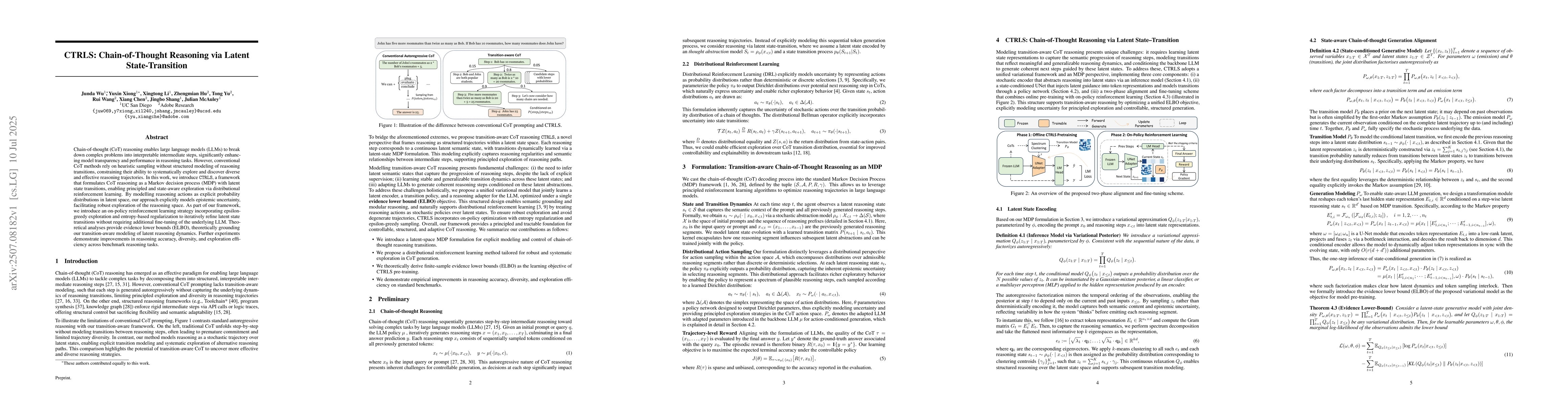 Chain-of-thought (CoT) reasoning enables large language models (LLMs) to break down complex problems into interpretable intermediate steps, significantly enhancing model transparency and performance in reasoning tasks. However, conventional CoT methods rely on heuristic sampling without structured modeling of reasoning transitions, constraining their ability to systematically explore and discover diverse and effective reasoning trajectories. In this work, we introduce CTRLS, a framework that formulates CoT reasoning as a Markov decision process (MDP) with latent state transitions, enabling principled and state-aware exploration via distributional reinforcement learning. By modelling reasoning actions as explicit probability distributions in latent space, our approach explicitly models epistemic uncertainty, facilitating robust exploration of the reasoning space. As part of our framework, we introduce an on-policy reinforcement learning strategy incorporating epsilon-greedy exploration and entropy-based regularization to iteratively refine latent state transitions without requiring additional fine-tuning of the underlying LLM. Theoretical analyses provide evidence lower bounds (ELBO), theoretically grounding our transition-aware modeling of latent reasoning dynamics. Further experiments demonstrate improvements in reasoning accuracy, diversity, and exploration efficiency across benchmark reasoning tasks.