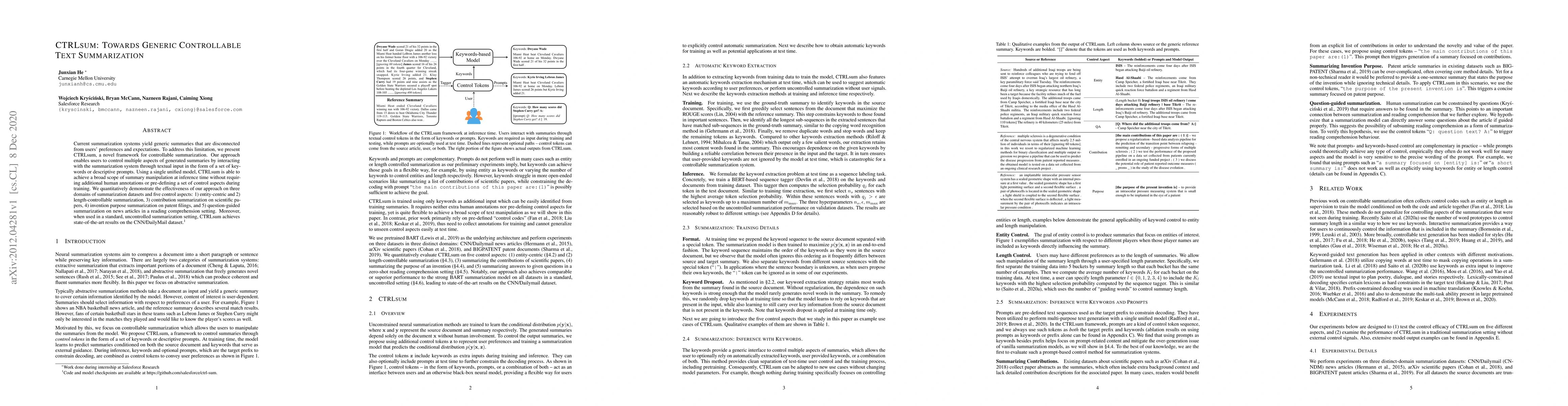 Current summarization systems yield generic summaries that are disconnected from users' preferences and expectations. To address this limitation, we present CTRLsum, a novel framework for controllable summarization. Our approach enables users to control multiple aspects of generated summaries by interacting with the summarization system through textual input in the form of a set of keywords or descriptive prompts. Using a single unified model, CTRLsum is able to achieve a broad scope of summary manipulation at inference time without requiring additional human annotations or pre-defining a set of control aspects during training. We quantitatively demonstrate the effectiveness of our approach on three domains of summarization datasets and five control aspects: 1) entity-centric and 2) length-controllable summarization, 3) contribution summarization on scientific papers, 4) invention purpose summarization on patent filings, and 5) question-guided summarization on news articles in a reading comprehension setting. Moreover, when used in a standard, uncontrolled summarization setting, CTRLsum achieves state-of-the-art results on the CNN/DailyMail dataset. Code and model checkpoints are available at https://github.com/salesforce/ctrl-sum