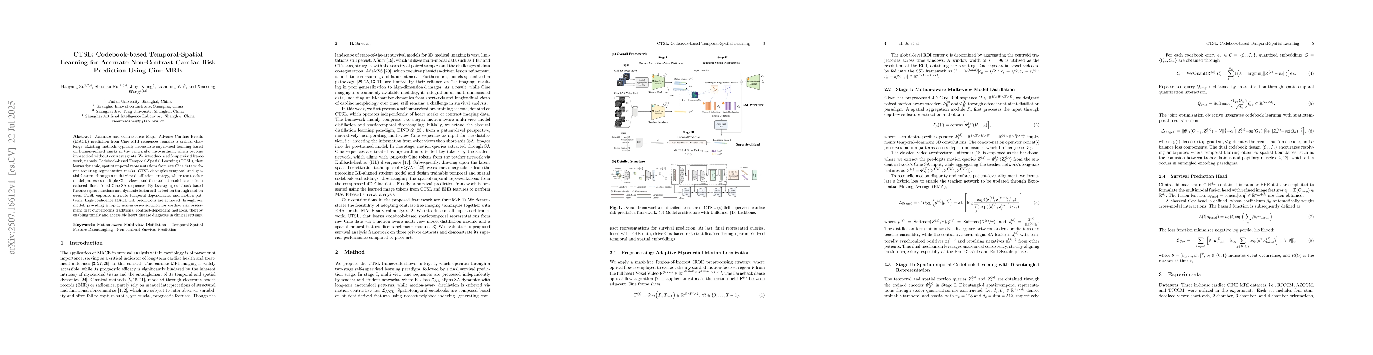 Accurate and contrast-free Major Adverse Cardiac Events (MACE) prediction from Cine MRI sequences remains a critical challenge. Existing methods typically necessitate supervised learning based on human-refined masks in the ventricular myocardium, which become impractical without contrast agents. We introduce a self-supervised framework, namely Codebook-based Temporal-Spatial Learning (CTSL), that learns dynamic, spatiotemporal representations from raw Cine data without requiring segmentation masks. CTSL decouples temporal and spatial features through a multi-view distillation strategy, where the teacher model processes multiple Cine views, and the student model learns from reduced-dimensional Cine-SA sequences. By leveraging codebook-based feature representations and dynamic lesion self-detection through motion cues, CTSL captures intricate temporal dependencies and motion patterns. High-confidence MACE risk predictions are achieved through our model, providing a rapid, non-invasive solution for cardiac risk assessment that outperforms traditional contrast-dependent methods, thereby enabling timely and accessible heart disease diagnosis in clinical settings.
