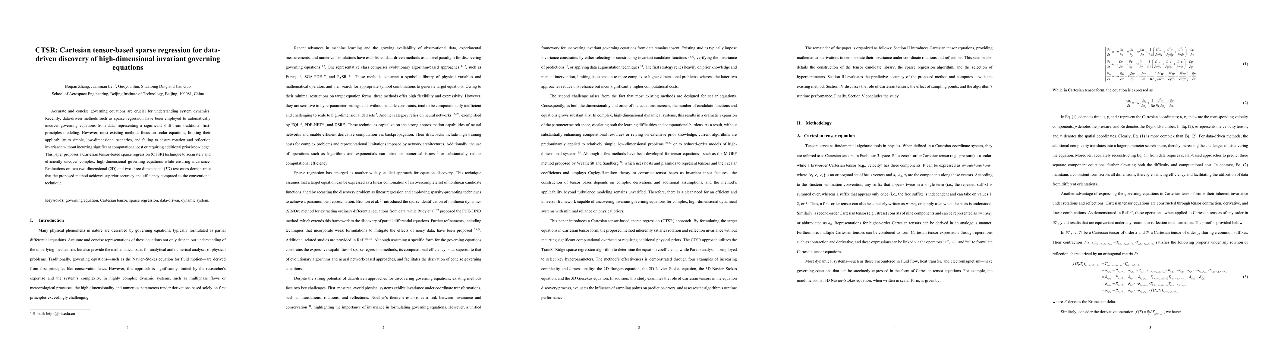 Accurate and concise governing equations are crucial for understanding system dynamics. Recently, data-driven methods such as sparse regression have been employed to automatically uncover governing equations from data, representing a significant shift from traditional first-principles modeling. However, most existing methods focus on scalar equations, limiting their applicability to simple, low-dimensional scenarios, and failing to ensure rotation and reflection invariance without incurring significant computational cost or requiring additional prior knowledge. This paper proposes a Cartesian tensor-based sparse regression (CTSR) technique to accurately and efficiently uncover complex, high-dimensional governing equations while ensuring invariance. Evaluations on two two-dimensional (2D) and two three-dimensional (3D) test cases demonstrate that the proposed method achieves superior accuracy and efficiency compared to the conventional technique.