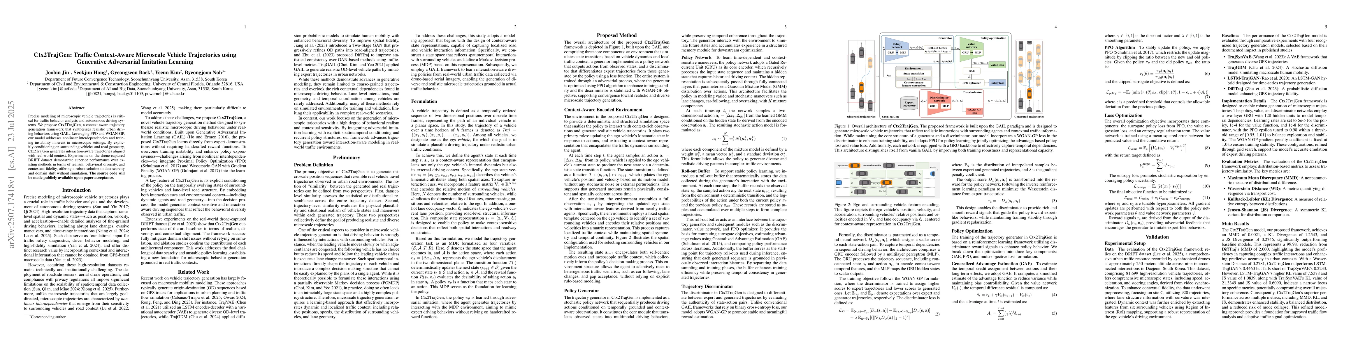 Precise modeling of microscopic vehicle trajectories is critical for traffic behavior analysis and autonomous driving systems. We propose Ctx2TrajGen, a context-aware trajectory generation framework that synthesizes realistic urban driving behaviors using GAIL. Leveraging PPO and WGAN-GP, our model addresses nonlinear interdependencies and training instability inherent in microscopic settings. By explicitly conditioning on surrounding vehicles and road geometry, Ctx2TrajGen generates interaction-aware trajectories aligned with real-world context. Experiments on the drone-captured DRIFT dataset demonstrate superior performance over existing methods in terms of realism, behavioral diversity, and contextual fidelity, offering a robust solution to data scarcity and domain shift without simulation.