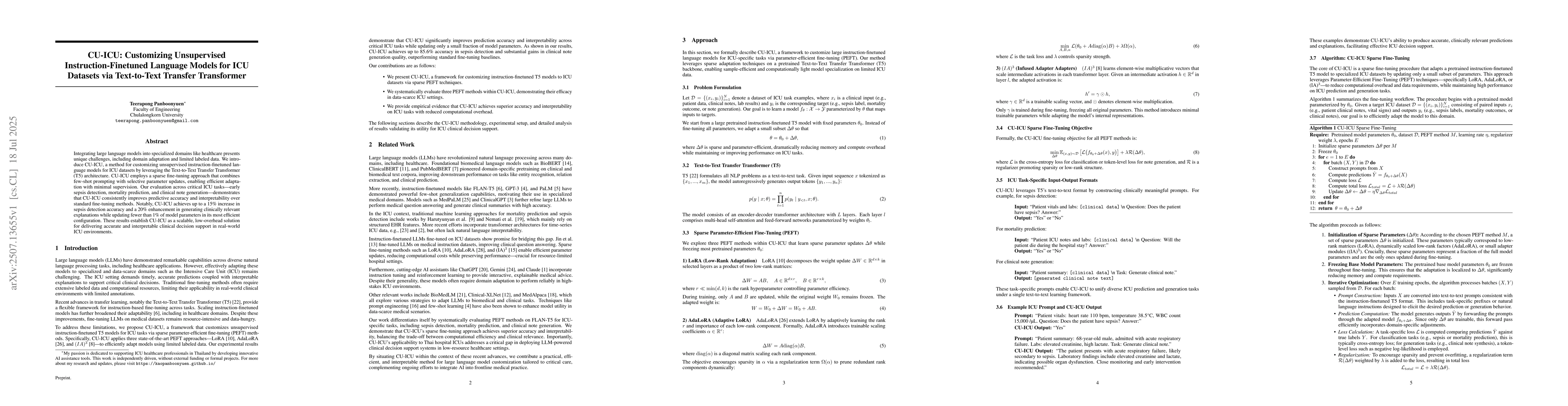 Integrating large language models into specialized domains like healthcare presents unique challenges, including domain adaptation and limited labeled data. We introduce CU-ICU, a method for customizing unsupervised instruction-finetuned language models for ICU datasets by leveraging the Text-to-Text Transfer Transformer (T5) architecture. CU-ICU employs a sparse fine-tuning approach that combines few-shot prompting with selective parameter updates, enabling efficient adaptation with minimal supervision. Our evaluation across critical ICU tasks--early sepsis detection, mortality prediction, and clinical note generation--demonstrates that CU-ICU consistently improves predictive accuracy and interpretability over standard fine-tuning methods. Notably, CU-ICU achieves up to a 15% increase in sepsis detection accuracy and a 20% enhancement in generating clinically relevant explanations while updating fewer than 1% of model parameters in its most efficient configuration. These results establish CU-ICU as a scalable, low-overhead solution for delivering accurate and interpretable clinical decision support in real-world ICU environments.