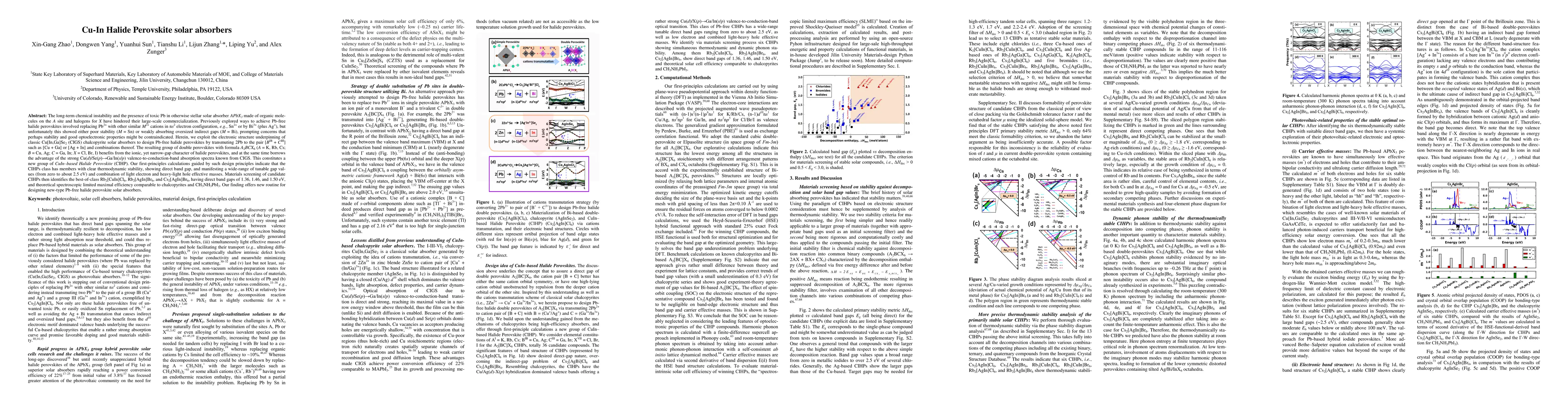 The long-term chemical instability and the presence of toxic Pb in otherwise stellar solar absorber APbX$_{3}$ have hindered their large-scale commercialization. Previously explored ways to achieve Pb-free halide perovskites involved replacing Pb$^{2+}$ with other similar M$^{2+}$ cations in ns$^2$ electron configuration, e.g., Sn$^{2+}$ or by Bi$^{3+}$ (plus Ag$^+$), but unfortunately this showed either poor stability (M = Sn) or weakly absorbing oversized indirect gaps (M = Bi), prompting concerns that perhaps stability and good optoelectronic properties might be contraindicated. Herein, we exploit the electronic structure underpinning of classic Cu[In,Ga]Se$_{2}$ (CIGS) chalcopyrite solar absorbers to design Pb-free halide perovskites by transmuting 2Pb to the pair [B$^{IB}$ + C$^{III}$]. The resulting group of double perovskites with formula A$_2$BCX$_6$ (A = K, Rb, Cs; B = Cu, Ag; C = Ga, In; X = Cl, Br, I) benefits from the ionic, yet narrow-gap character of halide perovskites, and at the same time borrows the advantage of the strong and rapidly rising Cu(d)/Se(p) $\rightarrow$ Ga/In(s/p) valence-to-conduction-band absorption spectra known from CIGS. This constitutes a new group of CuIn-based Halide Perovskite (CIHP). Our first-principles calculations guided by such design principles indicate that the CIHPs class has members with clear thermodynamic stability, showing rather strong direct-gap optical transitions, and manifesting a wide-range of tunable gap values (from zero to about 2.5 eV) and combination of light electron and heavy-light hole effective masses. Materials screening of candidate CHIPs then identifies the best-of-class Rb$_2$[CuIn]Cl$_6$, Rb$_2$[AgIn]Br$_6$ and Cs$_2$[AgIn]Br$_6$, having direct band gaps of 1.36, 1.46 and 1.50 eV, and a theoretical spectroscopic limited maximal efficiency comparable to chalcopyrites and CH$_3$NH$_3$PbI$_3$.