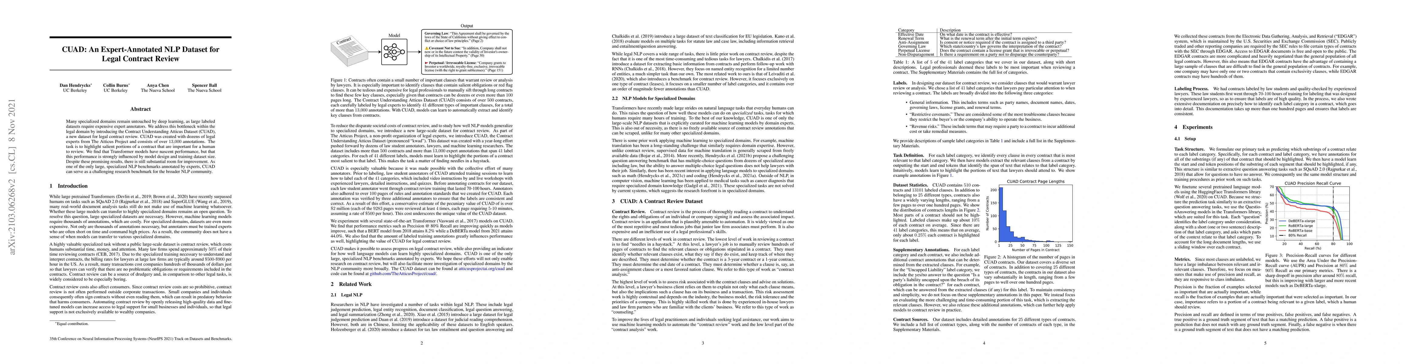 The CUAD dataset, created by legal experts, provides over 13,000 annotations for legal contract review, aiming to highlight important contract sections. Initial Transformer models show potential but require further optimization and larger training datasets for better performance.