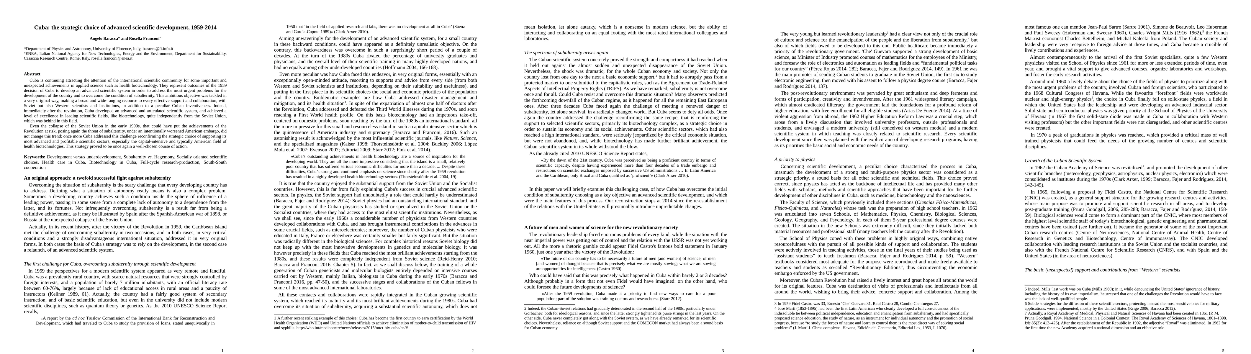 Cuba is continuing attracting the attention of the international scientific community for some important and unexpected achievements in applied science such as health biotechnology. They represent outcomes of the 1959 decision of Cuba to develop an advanced scientific system in order to address the most urgent problems for the development of the country and to overcome the condition of subalternity. This ambitious objective was tackled in a very original way, making a broad and wide-ranging recourse to every effective support and collaboration, with Soviet but also Western scientists and institutions, in addition to a peculiar Cuban inventiveness. Indeed, immediately after the revolution, Cuba developed an advanced and articulated scientific system, and achieved a level of excellence in leading scientific fields, like biotechnology, quite independently from the Soviet Union, which was behind in this field. Even the collapse of the Soviet Union in the early 1990s, that could have put the achievements of the Revolution at risk, posing again the threat of subalternity, under an intentionally worsened American embargo, did not change this trend: once more Cuba addressed this challenge reconfirming the strategic choice of supporting its most advanced and profitable scientific sectors, especially the capital-intensive and typically American field of health biotechnologies. This strategy proved to be once again a well-chosen course of action.