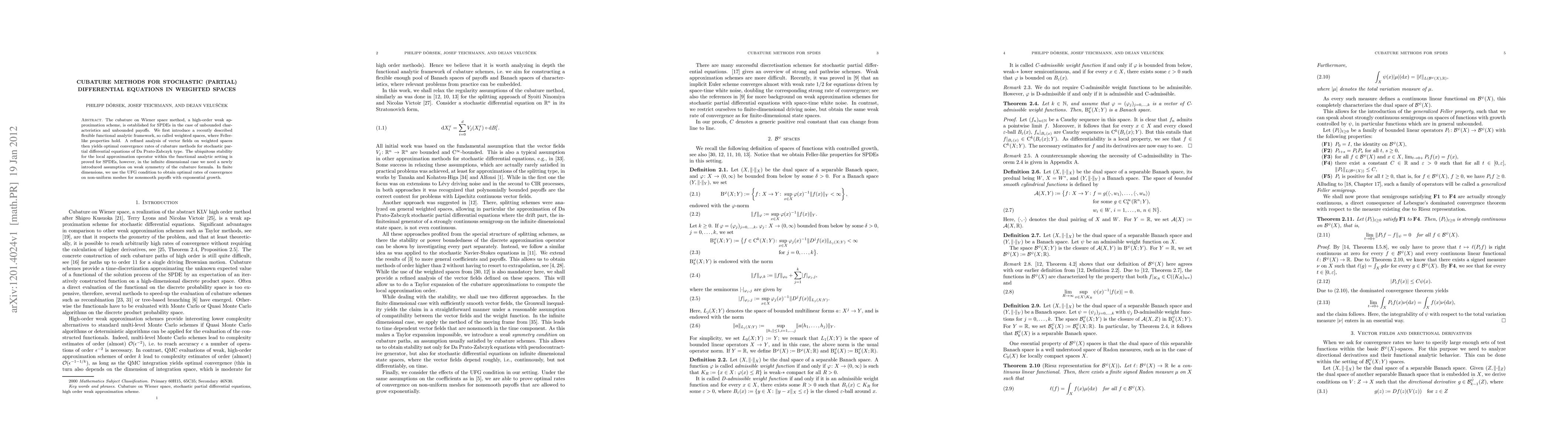 This paper establishes a high-order weak approximation scheme, the cubature on Wiener space method, for stochastic partial differential equations (SPDEs) in weighted spaces. It proves optimal convergence rates and stability for local approximation operators, introducing a new assumption on weak symmetry for infinite dimensions and using the UFG condition for finite dimensions.