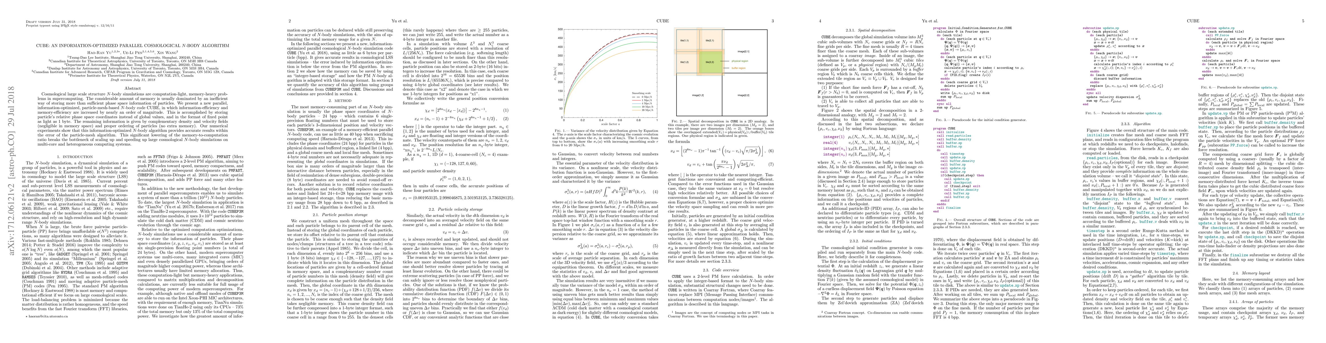 The paper introduces CUBE, an information-optimized parallel $N$-body algorithm that significantly reduces memory usage by storing particles' relative phase space coordinates in fixed-point format, achieving nearly an order of magnitude improvement in efficiency. This approach enables scaling up and speeding up large cosmological simulations on multi-core and heterogeneous computing systems.