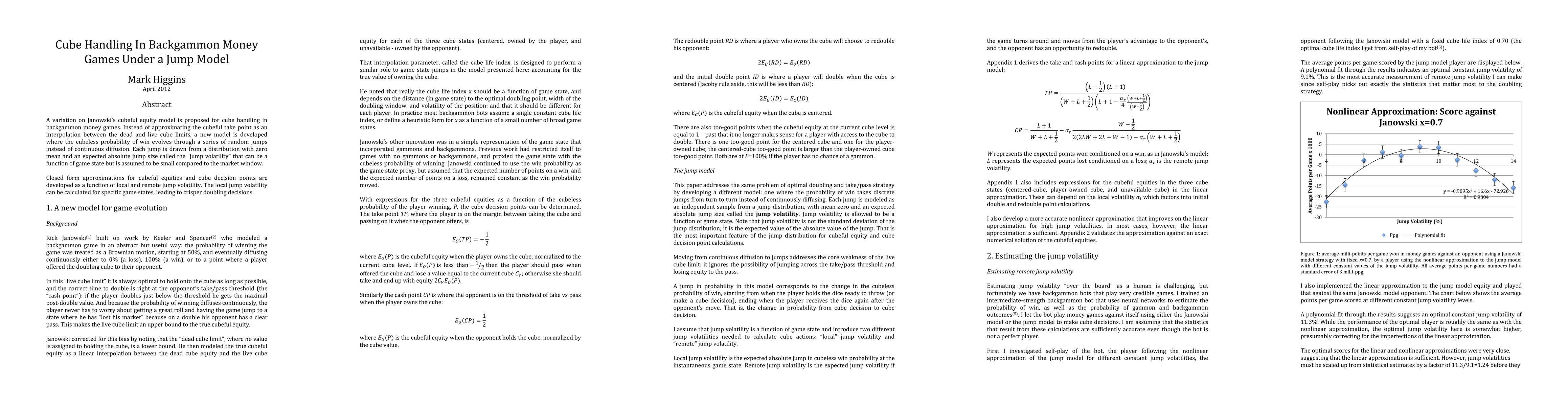 A variation on Janowski's cubeful equity model is proposed for cube handling in backgammon money games. Instead of approximating the cubeful take point as an interpolation between the dead and live cube limits, a new model is developed where the cubeless probability of win evolves through a series of random jumps instead of continuous diffusion. Each jump is drawn from a distribution with zero mean and an expected absolute jump size called the "jump volatility" that can be a function of game state but is assumed to be small compared to the market window. Closed form approximations for cubeful equities and cube decision points are developed as a function of local and remote jump volatility. The local jump volatility can be calculated for specific game states, leading to crisper doubling decisions.
