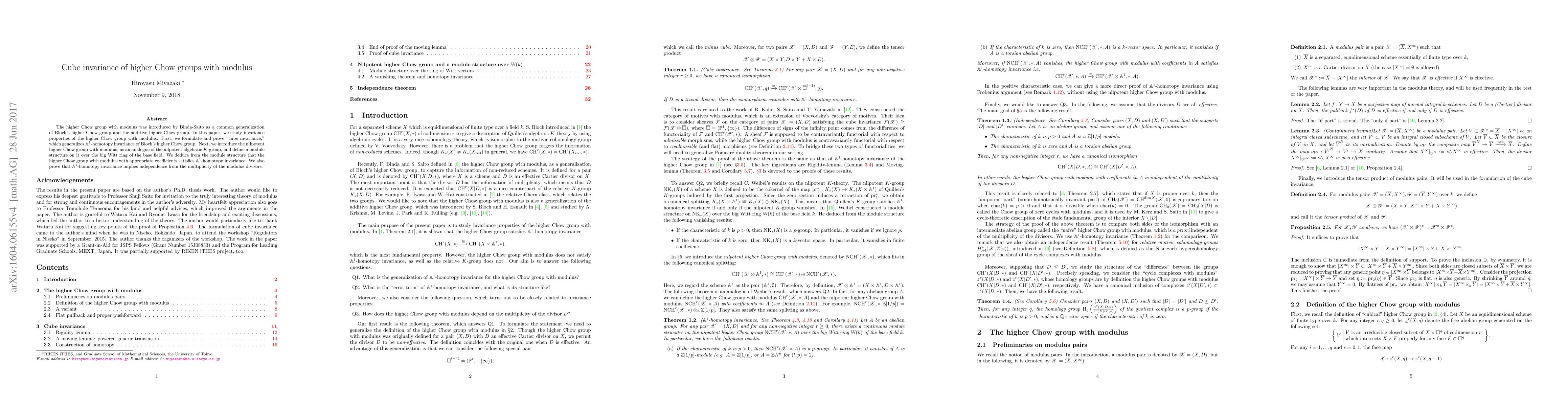 Summary: This paper establishes the "cube invariance" of higher Chow groups with modulus, extending $\mathbb{A}^1$-homotopy invariance. It introduces a nilpotent higher Chow group with modulus, demonstrating its module structure over the big Witt ring, which confirms the groups' $\mathbb{A}^1$-homotopy invariance and independence from modulus divisor multiplicities.