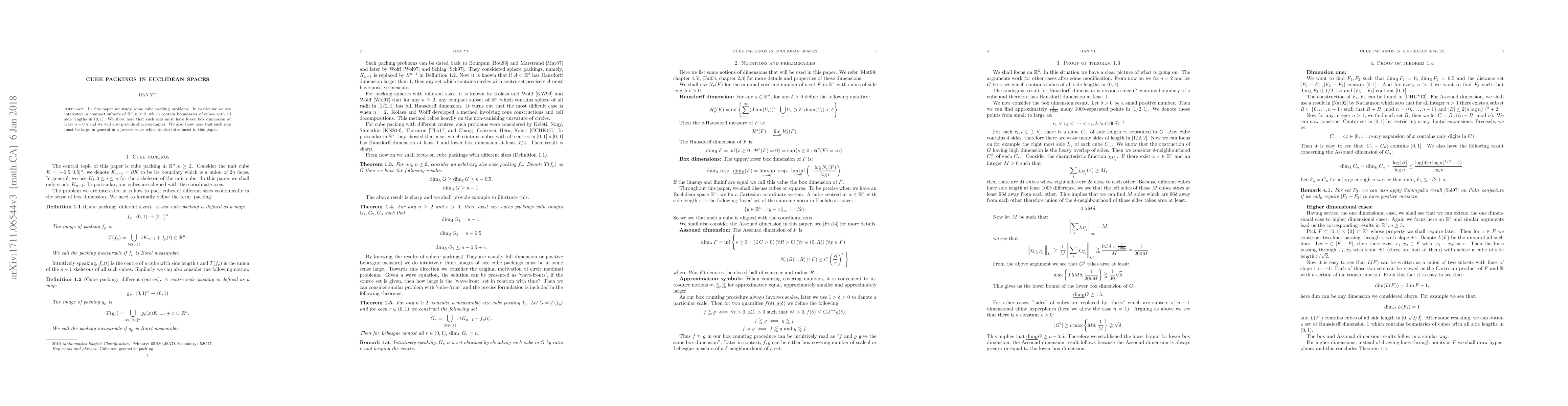 Researchers studied cube packings in Euclidean spaces, finding that compact subsets with cubes of side length (0,1) must have a lower box dimension of at least n-0.5 for n >= 2.