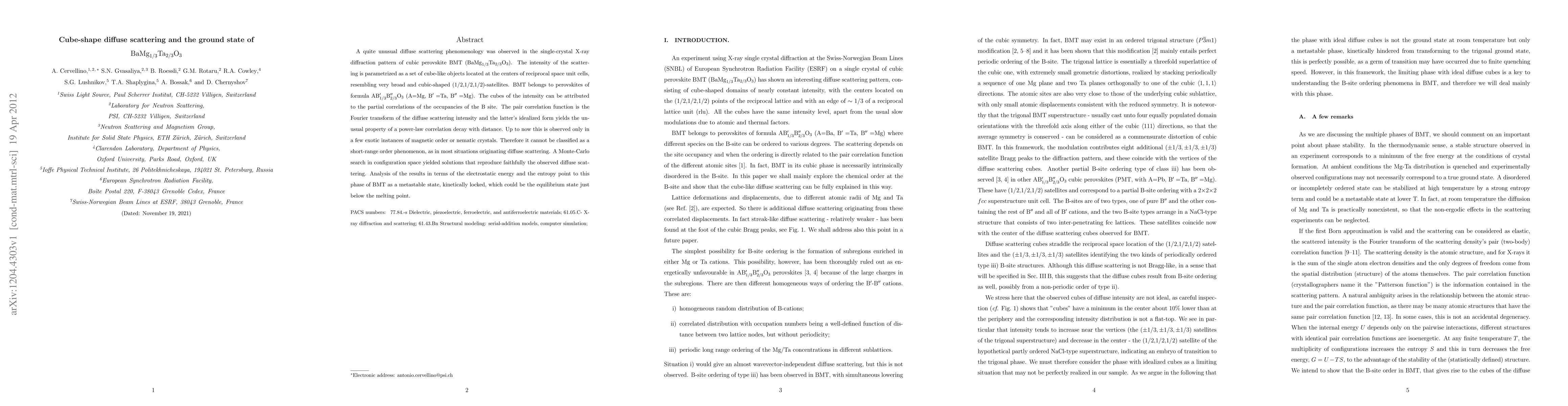 A quite unusual diffuse scattering phenomenology was observed in the single-crystal X-ray diffraction pattern of cubic perovskite BMT ($\mathrm{BaMg}_{1/3}\mathrm{Ta}_{2/3}\mathrm{O}_3$). The intensity of the scattering is parametrized as a set of cube-like objects located at the centers of reciprocal space unit cells, resembling very broad and cubic-shaped (1/2,1/2,1/2)-satellites. BMT belongs to perovskites of formula AB$'_{1/3}$B$"_{2/3}$O$_{3}$ (A=Mg, B$'=$Ta, B$"=$Mg). The cubes of the intensity can be attributed to the partial correlations of the occupancies of the B site. The pair correlation function is the Fourier transform of the diffuse scattering intensity and the latter's idealized form yields the unusual property of a power-law correlation decay with distance. Up to now this is observed only in a few exotic instances of magnetic order or nematic crystals. Therefore it cannot be classified as a short-range order phenomenon, as in most situations originating diffuse scattering. A Monte-Carlo search in configuration space yielded solutions that reproduce faithfully the observed diffuse scattering. Analysis of the results in terms of the electrostatic energy and the entropy point to this phase of BMT as a metastable state, kinetically locked, which could be the equilibrium state just below the melting point.