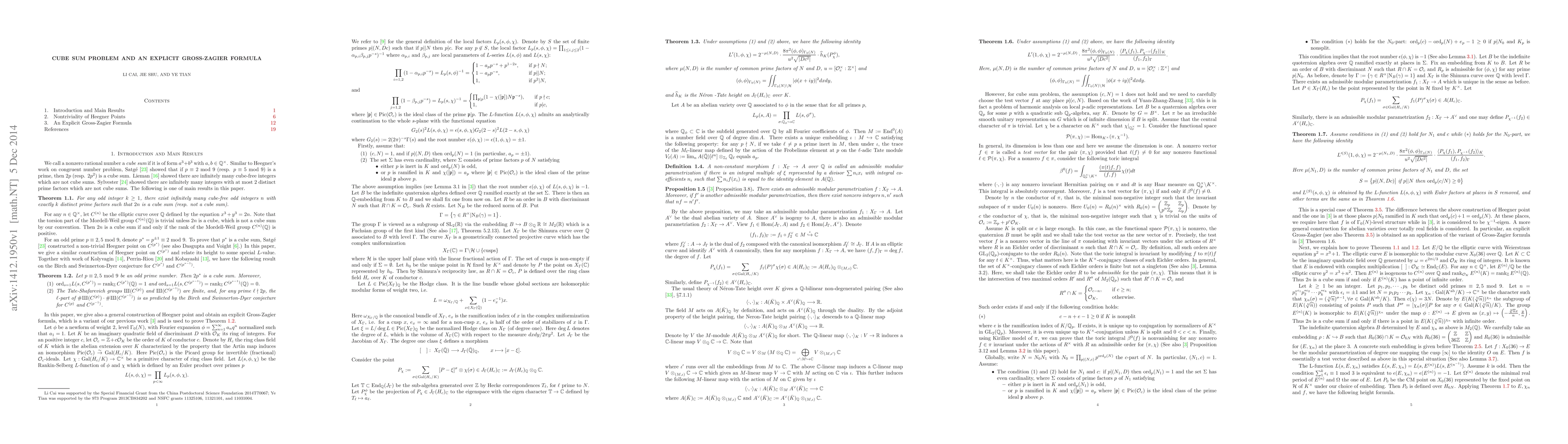 This paper proves the existence of infinitely many cube-free odd integers $n$ with $k$ distinct prime factors where $2n$ is either a cube sum or not, for any odd $k\geq 1$. It also provides an explicit Gross-Zagier formula and uses it to support the Birch and Swinnerton-Dyer conjecture for certain elliptic curves linked to the cube sum problem.