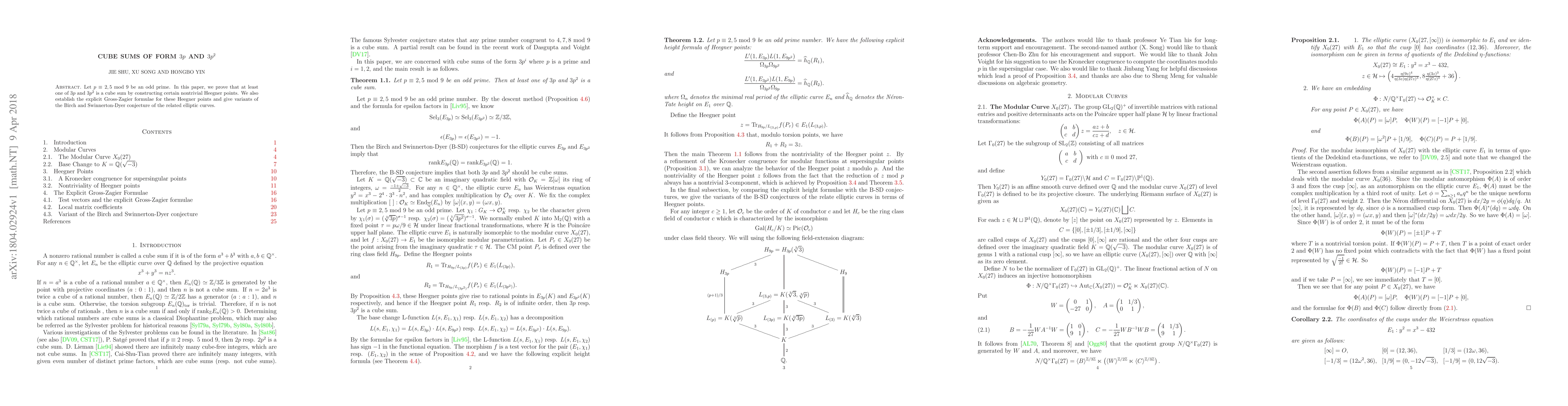 Let $p\equiv 2,5\mod 9$ be an odd prime. In this paper, we prove that at least one of $3p$ and $3p^2$ is a cube sum by constructing certain nontrivial Heegner points. We also establish the explicit Gross-Zagier formulae for these Heegner points and give variants of the Birch and Swinnerton-Dyer conjecture of the related elliptic curves.