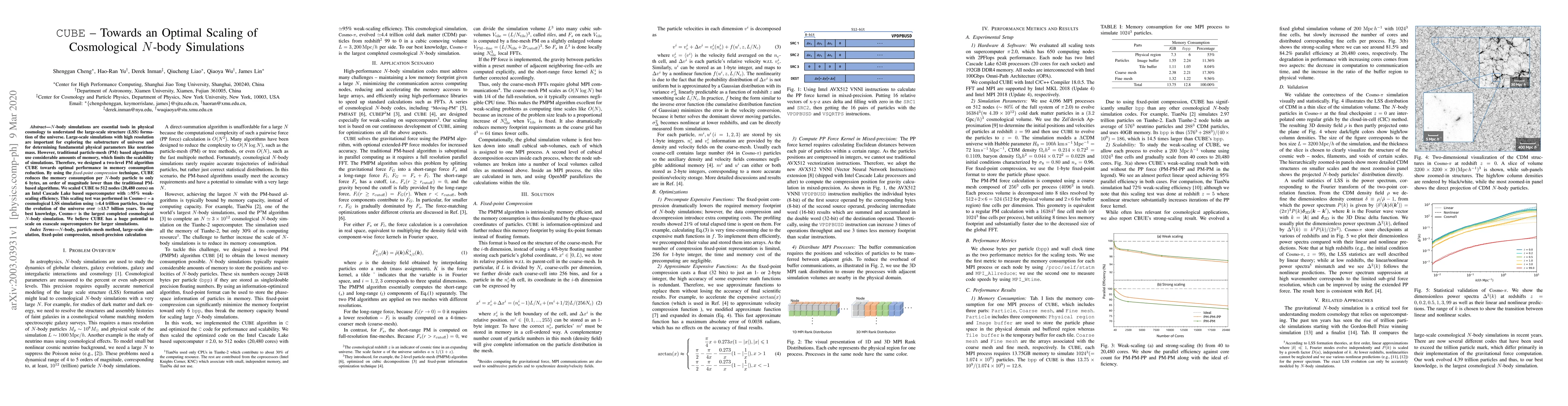 The paper introduces CUBE, a two-level particle-mesh algorithm designed to optimize memory consumption in cosmological N-body simulations, reducing memory per particle to 6 bytes. The authors demonstrate CUBE's scalability on a supercomputer, achieving 95% weak-scaling efficiency with Cosmo-$\pi$, the largest completed cosmological N-body simulation involving 4.4 trillion particles.