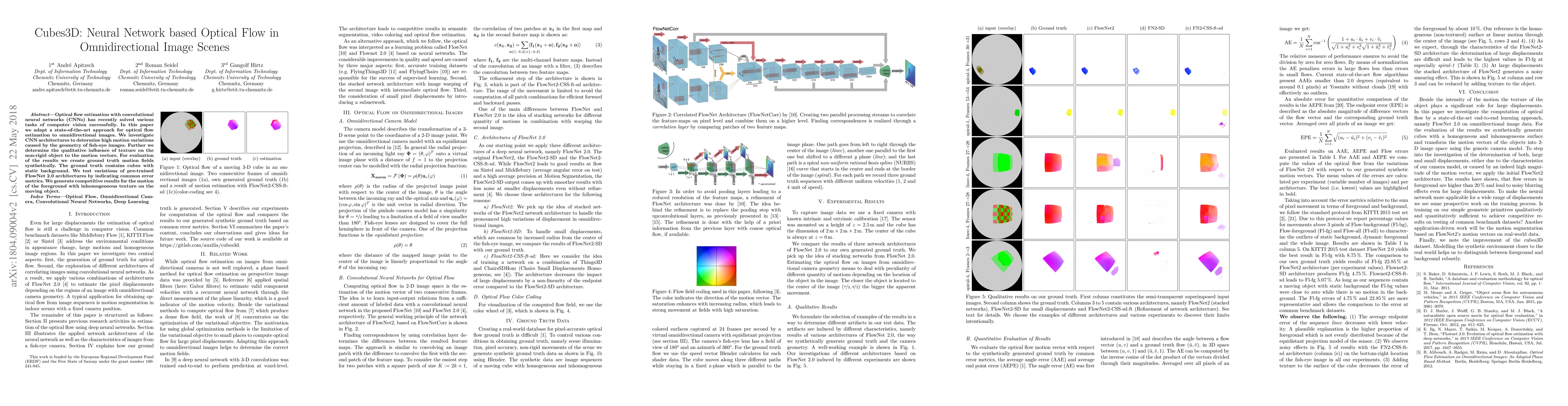 Optical flow estimation with convolutional neural networks (CNNs) has recently solved various tasks of computer vision successfully. In this paper we adapt a state-of-the-art approach for optical flow estimation to omnidirectional images. We investigate CNN architectures to determine high motion variations caused by the geometry of fish-eye images. Further we determine the qualitative influence of texture on the non-rigid object to the motion vectors. For evaluation of the results we create ground truth motion fields synthetically. The ground truth contains cubes with static background. We test variations of pre-trained FlowNet 2.0 architectures by indicating common error metrics. We generate competitive results for the motion of the foreground with inhomogeneous texture on the moving object.