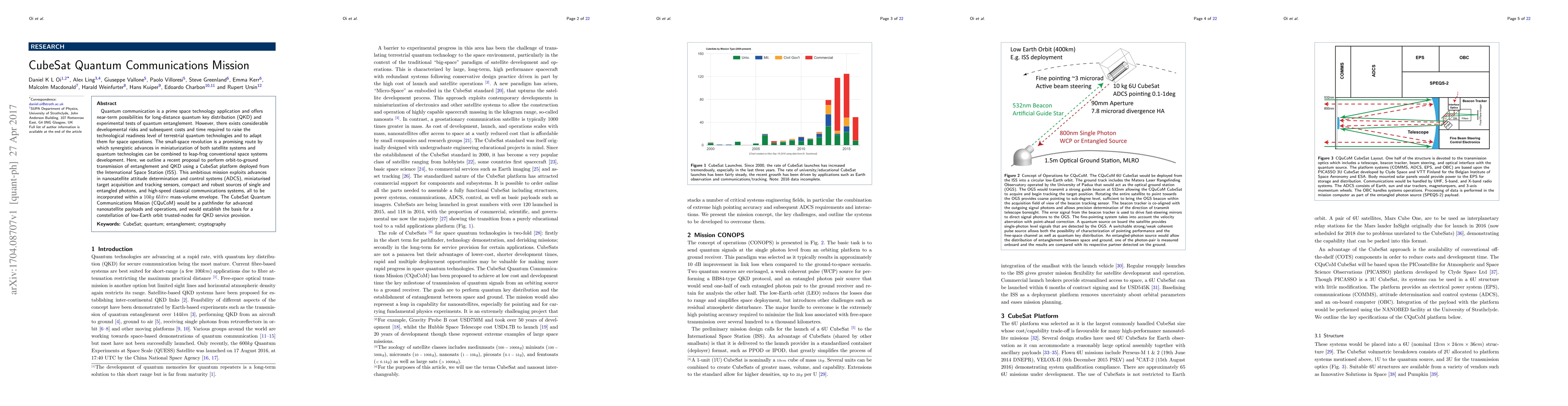 The CubeSat Quantum Communications Mission (CQuCoM) proposes to use a CubeSat deployed from the ISS to perform orbit-to-ground quantum key distribution and entanglement tests, leveraging miniaturized quantum and satellite technologies to advance space quantum communications. This mission aims to establish a foundation for future low-Earth orbit quantum communication networks.