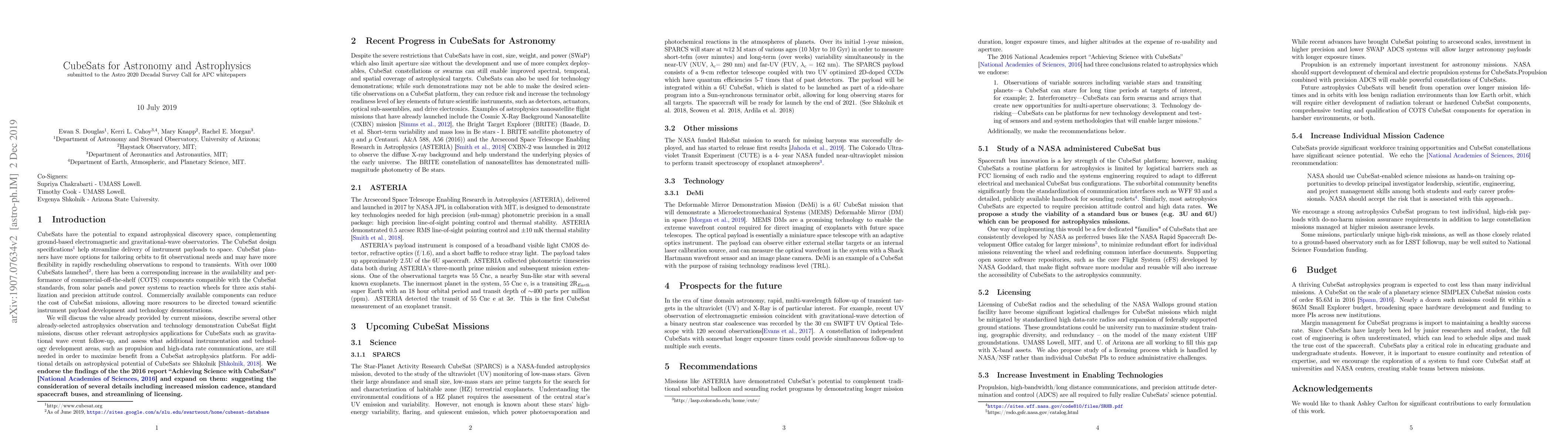 The paper presents CubeSats as a viable platform for technology demonstrations and astrophysics missions, showcasing successful missions like ASTERIA, SPARCS, and HaloSat, and advocating for standardized communication interfaces and flight software.