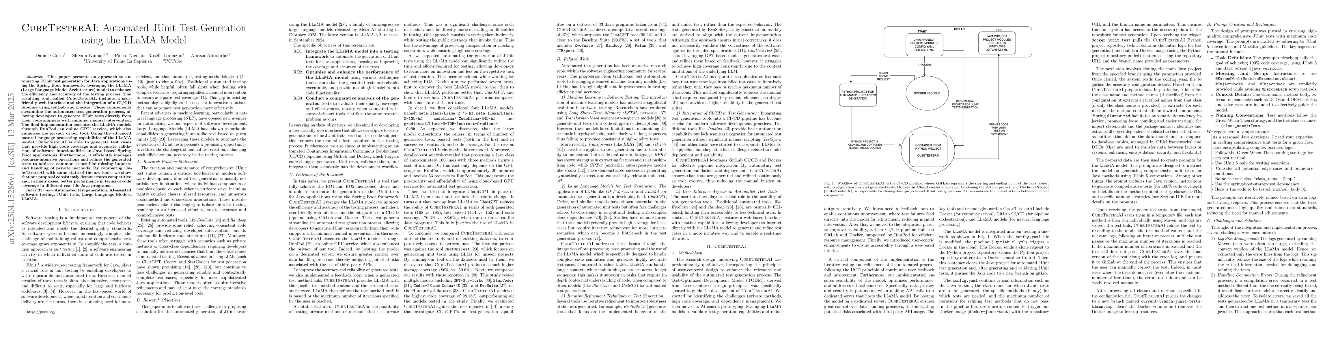 This research methodology involves using the LLaMA model, specifically the L70B variant, integrated into a CI/CD pipeline using GitLab and Docker to automate JUnit test generation for Java applications, particularly those using the Spring Boot framework. The tool, named CUBETESTERAI, includes a user-friendly web interface and efficient resource management through RunPod, an online GPU service.