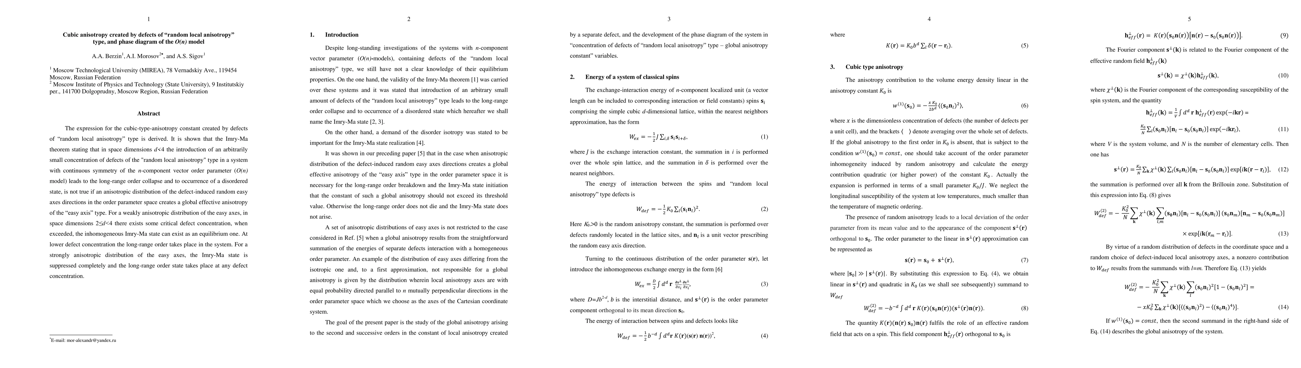 This paper derives the expression for cubic anisotropy from "random local anisotropy" defects and examines the phase diagram of the O(n) model. It challenges the Imry-Ma theorem by showing that a weakly anisotropic distribution of defect-induced easy axes can sustain an inhomogeneous state, while a strongly anisotropic distribution leads to complete suppression of the Imry-Ma state and restoration of long-range order.