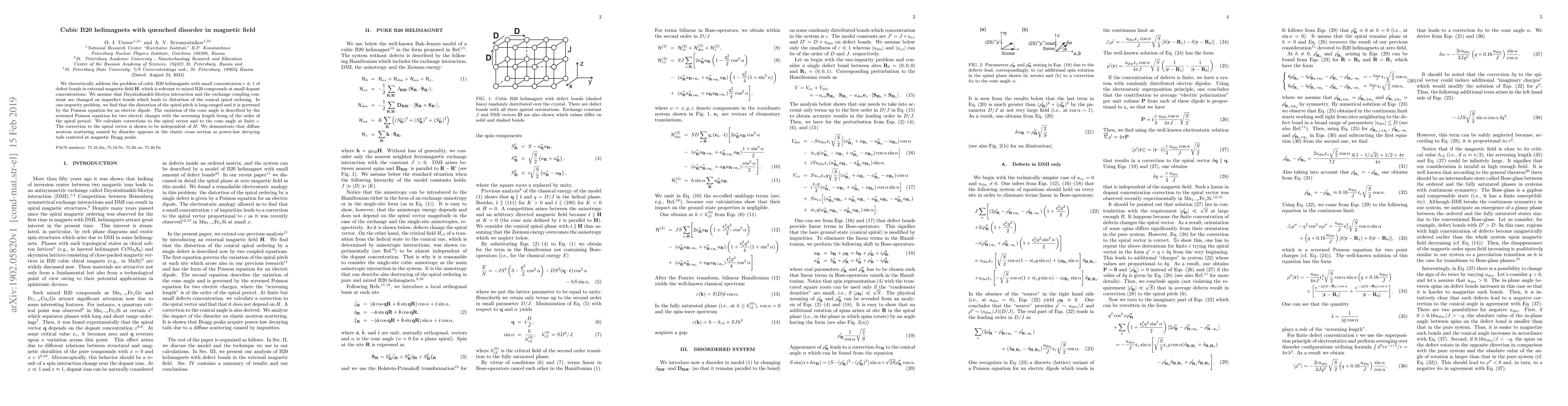 We theoretically address the problem of cubic B20 helimagnets with small concentration ${c \ll 1}$ of defect bonds in external magnetic field $\bf H$, which is relevant to mixed B20 compounds at small dopant concentrations. We assume that Dzyaloshinskii-Moriya interaction and the exchange coupling constant are changed on imperfect bonds which leads to distortion of the conical spiral ordering. In one-impurity problem, we find that the distortion of the spiral pitch is long-ranged and it is governed by the Poisson equation for an electric dipole. The variation of the cone angle is described by the screened Poisson equation for two electric charges with the screening length being of the order of the spiral period. We calculate corrections to the spiral vector and to the cone angle at finite $c$. The correction to the spiral vector is shown to be independent of $H$. We demonstrate that diffuse neutron scattering caused by disorder appears in the elastic cross section as power-law decaying tails centered at magnetic Bragg peaks.